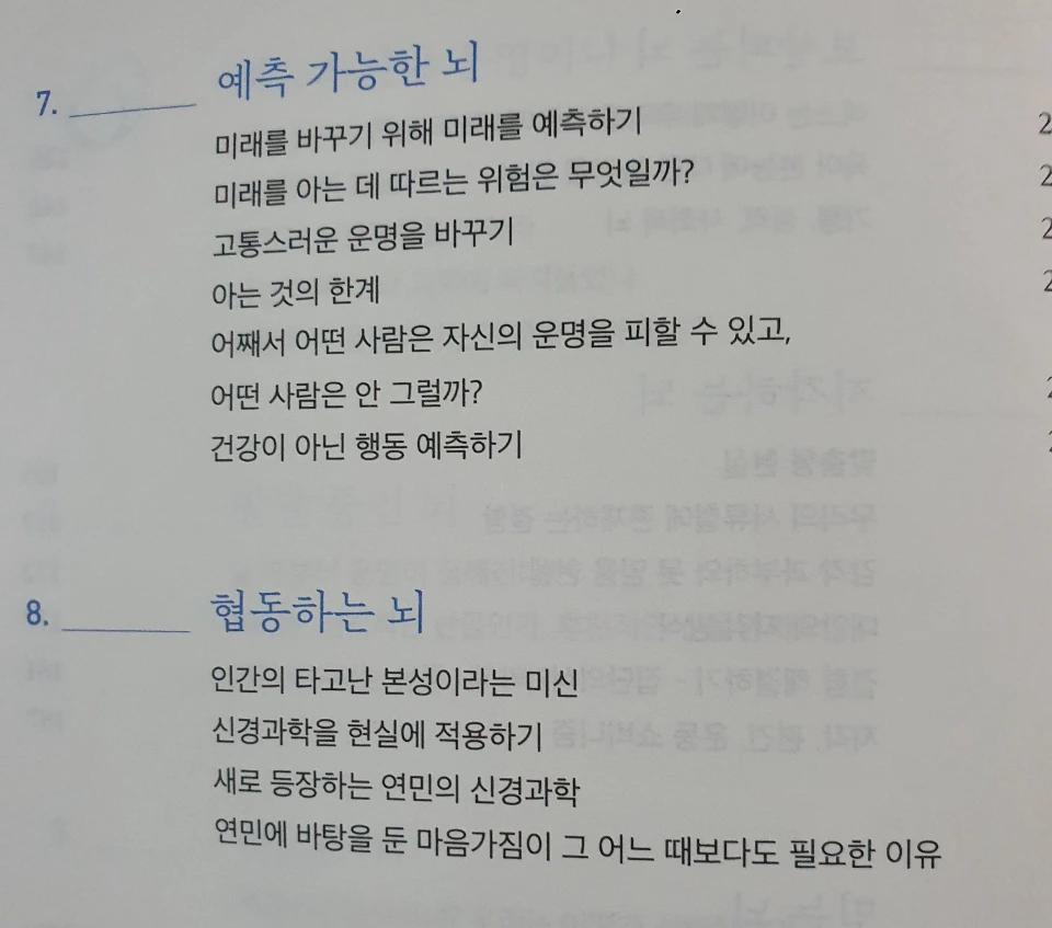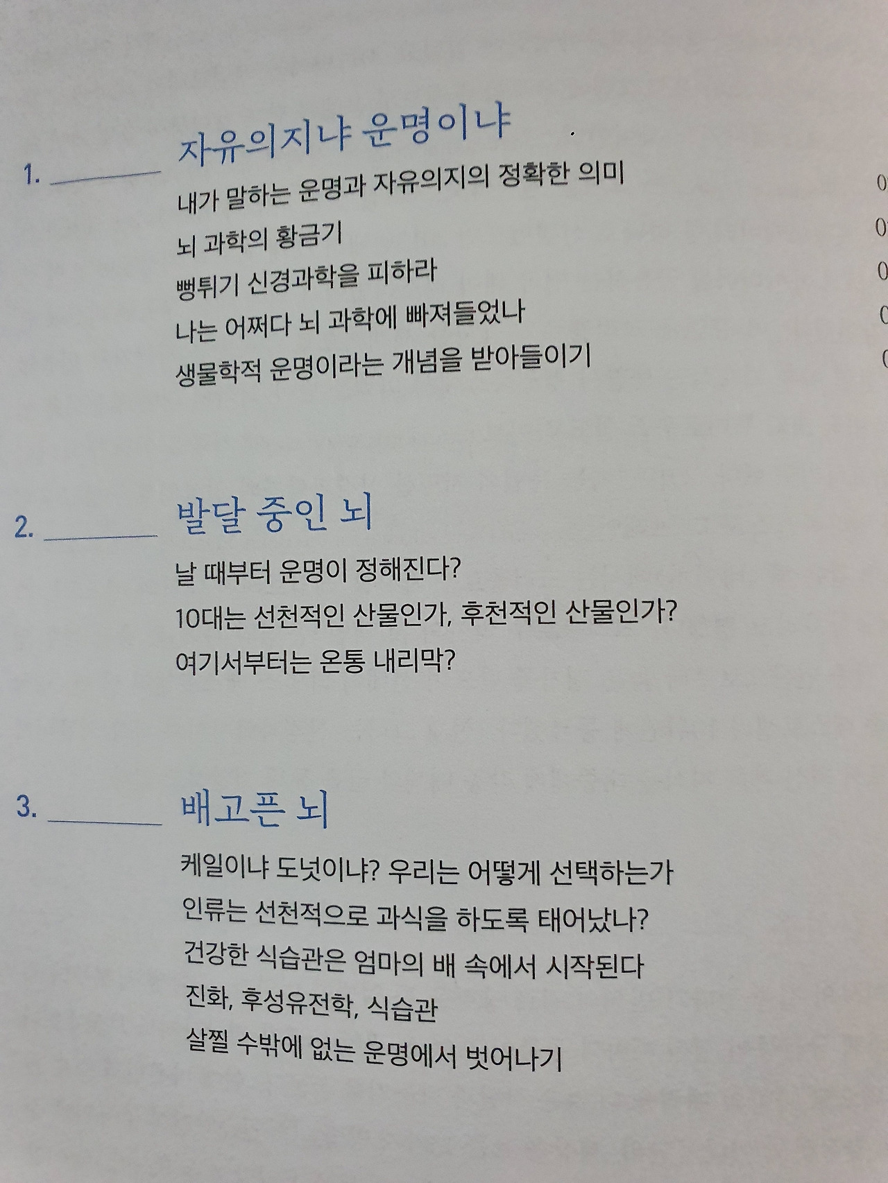 <운명의 과학>의 구성은 매우 탄탄하다. 아래 목차에서 볼 수 있듯이 뇌를 정말 다양한 관점에서 설명하고 있다. 특히 정말 마음에 들었던 점은 크리츨로우 박사 자신도 캠브리지/옥스포드에서 연구한 세계 최고 수준의 과학자이지만 더 깊은 이해를 위해 정말 많은 분야의 전문가를 직접 인터뷰했다는 것이다. 그 유명한 “던바의 수(150)”의 던바 교수도 인터뷰를 했다.