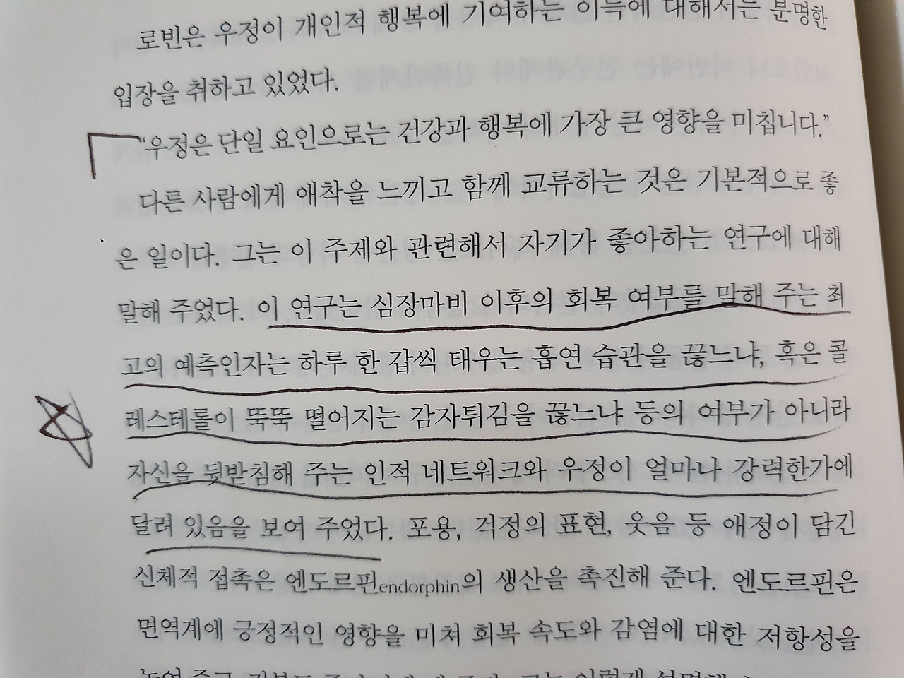 사회적 뇌 부분에서는 그 유명한 던바 교수가 나와서 우리가 다른 사람들과 교류하는 것이 얼마나 중요한지 설명해준다. (정말 많은 내용이 나오니 책을 꼭 읽어보기를 바란다.) 그 중에서 하나만 언급하면 아래 나온 것처럼 심장마비 이후 회복할 때 가장 중요한 요소는 먹는 것도 운동도 아닌 바로 인간관계다. 우리는 진사회성 동물이기 때문에 DNA에 함께 생활하는 것이 기본 값으로 입력되어 있다. 하지만 기술의 발달로 피상적 인간관계가 보편화 되고 있기 때문에 이 부분에 대해 이해가 낮으면 자신은 전혀 의도하지 않았지만 생각보다 건강에 많은 악영향을 받을 수 있다.