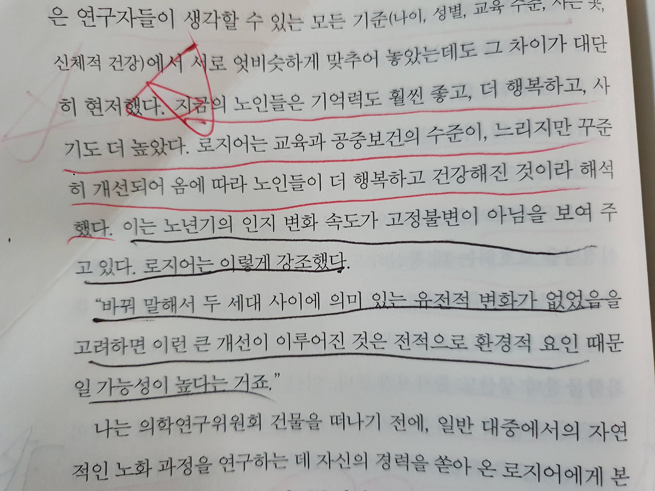 크리츨로우 교수는 신경과학자이다. 그래서 유전적으로 결정된 부분은 생각보다 바꾸기 힘들다고 말한다. 하지만 그래도 올바른 전략이 있으면 생각보다 많이 나아질 수 있다는 현실적인 조언을 해준다. 특히 20년 동안 노인들의 인지능력, 건강 상태, 행복도 등을 20년 간격으로 설문조사 했을 때 지금의 노인들은 20년 전 노인보다 모든 면에서 더 좋은 결과를 답했다. 유전적으로 바뀐 것이 없는 상태에서 노인들의 인생이 전반적으로 나아졌다는 것은 후천적인 환경적 요소가 매우 크게 작용했음을 알 수 있다.