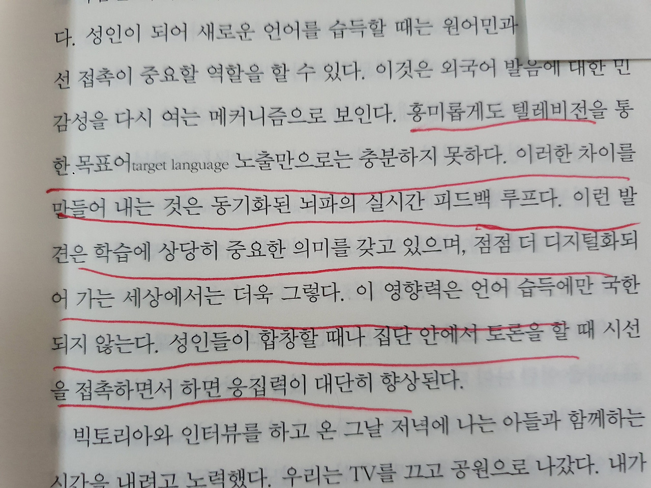 최신 뇌과학에 대한 지식을 삶에 적용하면 당장 많은 부분에서 효과를 얻을 수 있다. 특히 아래에 언급된 시선에 관한 이야기는 정말 인상적이다. 저자는 유아기 뇌 발달 연구에 최고 권위자 중 한명인 캠브리지 대학교의 빅토리아 교수를 직접 만나서 인터뷰를 했다. 빅토리아 교수는 아이를 양육할 때 가장 중요한 점은 바로 아이컨택이라고 강조했다. 똑같이 교육을 받아도 부모 혹은 교사가 아이와 아이컨택을 했을 때 그 효과는 훨씬 컸다. 더욱 놀라운 점은 시선을 맞추면 성인들이 교육을 받거나 팀활동을 할 때도 상당이 효과적이라는 점이다.