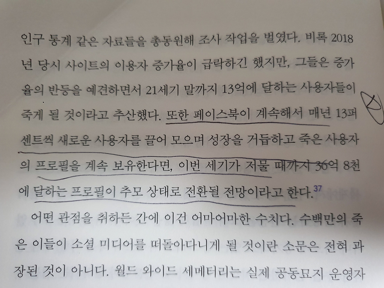 전혀 생각해보지 않았지만 앞으로 당연해질 상황은 어떤 SNS가 되었던 특정 시점이 되면 산 사람의 계정보다 죽은 사람의 계정이 많아진다는 것이다. 아래 <디지털 시대의 사후 세계>에 나온 부분을 인용하면 21세기 마지막이 되면 페이스북에는 약 37억 개의 죽은 사람의 계정이 생길 것이라고 추정된다. 지금 대세인 유튜브도 어느 순간부터는 산 사람보다 죽은 사람의 영상들이 더 많을 것이다. 만약에 그 사람이 죽은 줄 모른 상태에서 영상을 보고 진짜 팬이되었는데 알고 보니 그 사람이 죽은 사람이라면 어떤 생각이 들까? 이런 문제는 앞으로 점점 많아질 것이다.