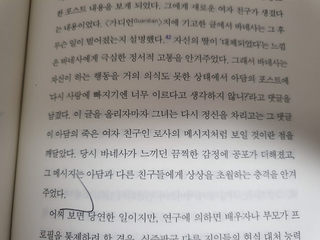 아래는 정말 디지털 시대이기 때문에 발생한 충격적인 이야기이다. <디지털 시대의 사후 세계>에 나오는 이야기인데 죽은 딸의 계정에 접속하던 엄마는 딸의 남자 친구가 새로운 여자 친구를 만나는 사실을 알게 된다. 그리고 감정이입이 너무 심하게 된 나머지 딸의 남자 친구에게 아쉬움이 담긴 메시지를 남긴다. 그런데 그 계정은 엄마의 계정이 아니다. 죽은 딸의 것이고, 죽었다고 생각한 전 여자친구가 말을 걸어왔다. 이 사건은 모두를 충격에 빠뜨린다. 새로운 시대의 새로운 문제이다.