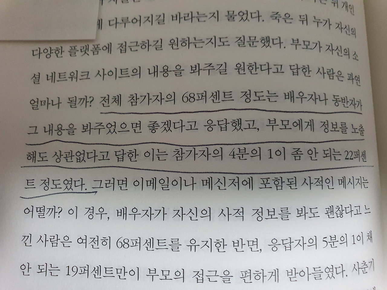 이제는 새로운(neo) 죽음의 심리학에 대해서 모두가 진지하게 고민해봐야 한다. 죽은 다음에 남은 디지털 유산에 대해 대부분의 사람은 부모님은 보기를 원하지 않는다고 생각했다. 하지만 죽은 자는 말이 없는 법. 만약에 부모님이 그것을 본다면 어떻게 될까? 자식을 잃은 부모님은 어떻게든 자식의 흔적을 더 많이 찾고 싶을 것이다. 그런데 디지털 유산은 온전히 자녀만의 것인가? 채팅 창이나 이메일에는 다른 사람과의 얘기가 가득한데 그것을 부모님이 볼 권리가 있는 것일까? 내가 부모 입장이라면 당연히 보고 싶을 것이다. 하지만 내가 이메일을 누군가의 부모님이 본다면 나는 또 싫다. 이렇게 모순이 가득한 곳이 <디지털 시대의 사후 세계>이다.