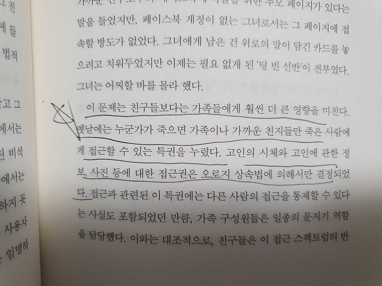 이 글의 제목처럼 디지털 시대의 죽음은 예전과는 전혀 다른 심리상태를 만들고 있다. 죽음에 대한 느낌도 다르고 추모하는 방식도 다르다. 또, 죽음에 대한 심리가 예전과 전혀 다르기 때문에 일반적인 유산과 디지털 유산은 처리하는 방식도 전혀 달라야 한다. <디지털 시대의 사후 세계>는 내가 진짜 살면서 생각해보지 못한 영역에 대한 진지한 고민을 하게 해주었다. 우리가 태어났다면 이제 인생에서 남은 가장 임팩트가 큰 사건은 아마 가장 두렵고 무서운 “죽음”일지도 모른다. 하지만 우리는 그 뒤를 경험할 수 없기 때문에 두려워하고 명확하게 인지하고 있으면서 외면하고 있는지도 모르겠다. 그럴수록 더 진지하게 들여다보면서 고민해봐야 한다. 그래야 내 죽음부터 그리고 사랑하는 사람들의 죽음까지 가장 인생에서 중요한 일을 조금 더 제대로 포용할 수 있을 것이다.