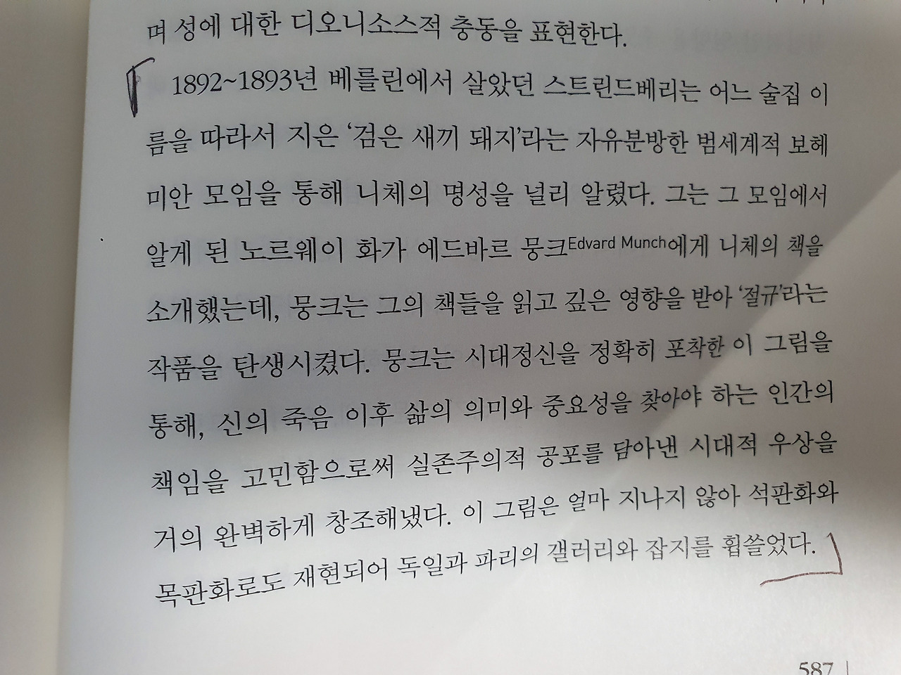 네 번째는 "생각"의 흐름이다. 니체의 첫 번째 책 <비극의 탄생>은 바그너에 관한 책이다. <니체의 삶>을 읽어보면 바그너가 니체에게 얼마나 큰 영향을 주었는지 알 수 있다. 그렇게 바그너는 음악으로 니체에게 영향을 주었고, 니체는 나중에 우리가 잘 알고 있는 '절규'라는 그림을 그린 뭉크에게 엄청난 영향을 준다. 음악이 철학책으로, 철학책이 그림으로 이어지는 모습을 보면서 뭔가 말로 설명할 수 없는 철학과 생각의 흐름을 볼 수 있었다.