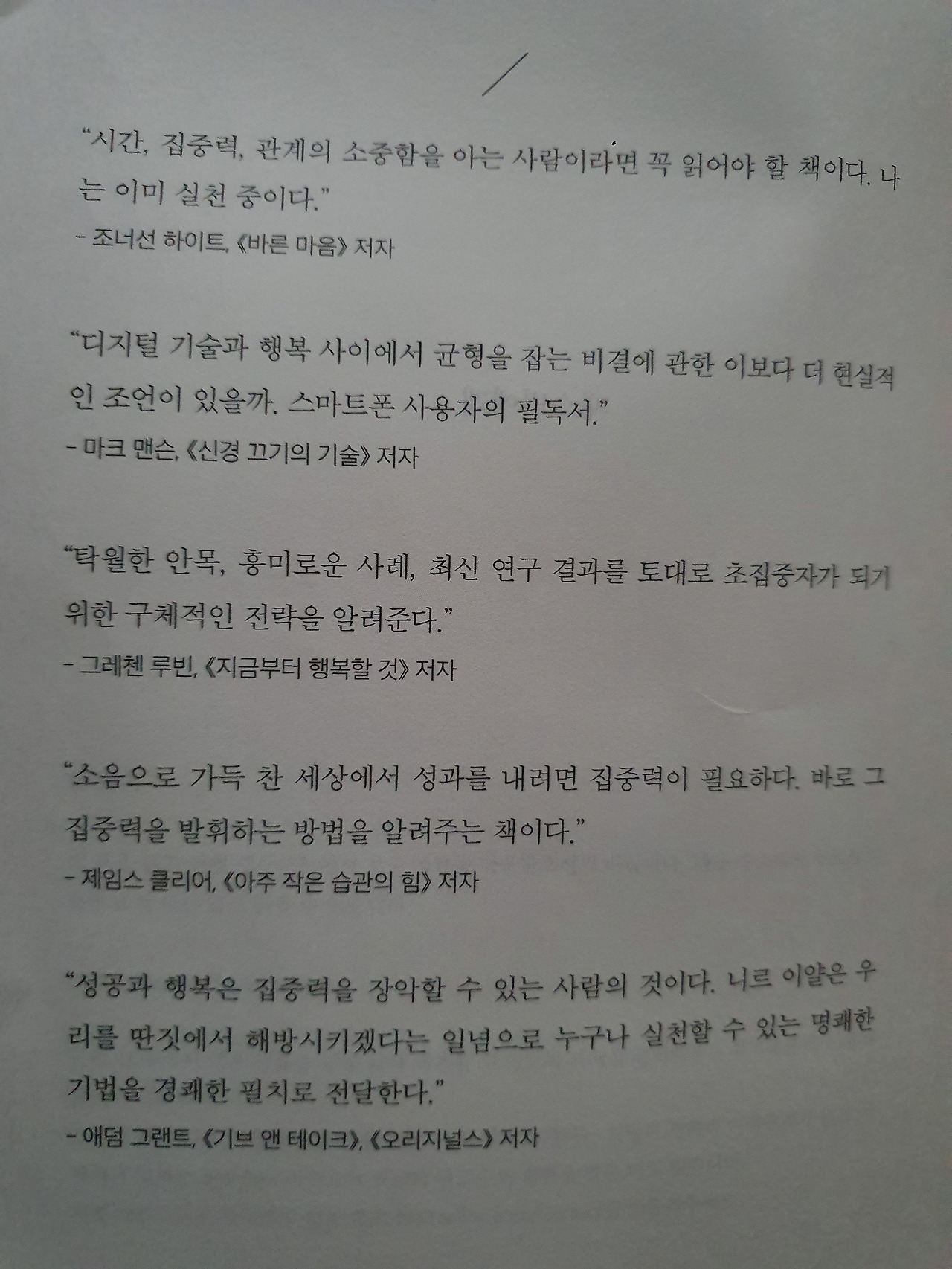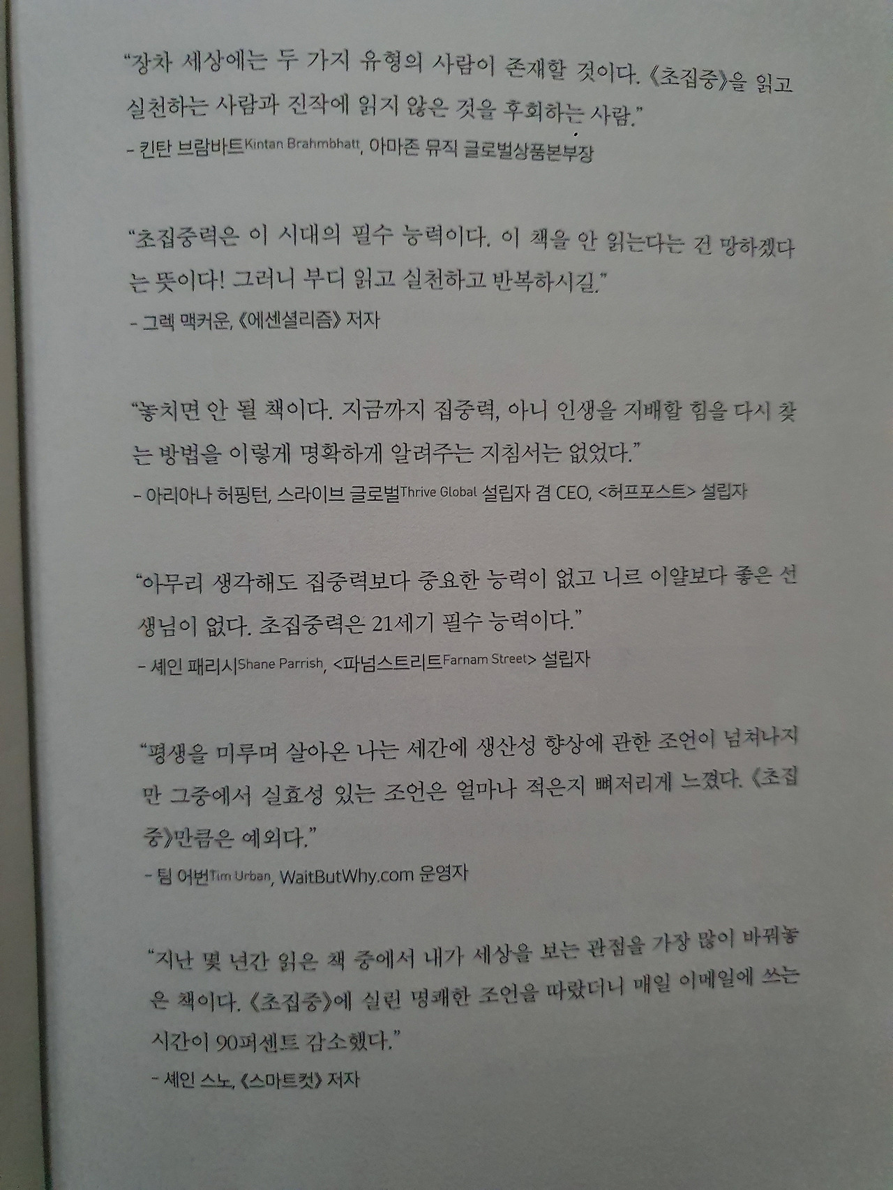 원래 나는 집중력이 좋은 편이 아니었다. 하지만 살면서 노력해서 집중력을 점점 올렸는데 그 수준이 임계점이 넘어가니까 내가 할 수 있는 일의 역량이 확 바뀌었다. 그리고 삶의 만족도가 확연하게 올라갔다. 개인적으로 집중력이 높은 편이지만 <초집중>을 읽으면서 더 올릴 수 있는 방법을 찾을 수 있었다. 앞에서 언급한 것처럼 이 책을 읽으면 거의 모든 사람이 자신에 삶에서 적용할 수 있는 부분을 발견할 것이다. <초집중>은 굉장히 유용한 실용서이다. 그러니 모두가 꼭 읽고 집중력 향상을 통해 더 밀도 있는 삶을 사는 것을 진심으로 응원한다.