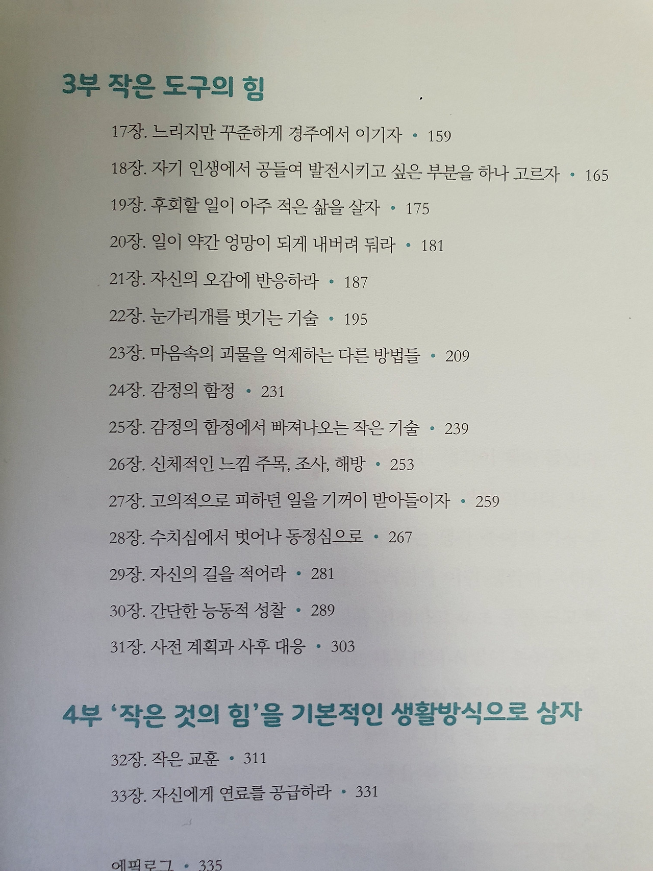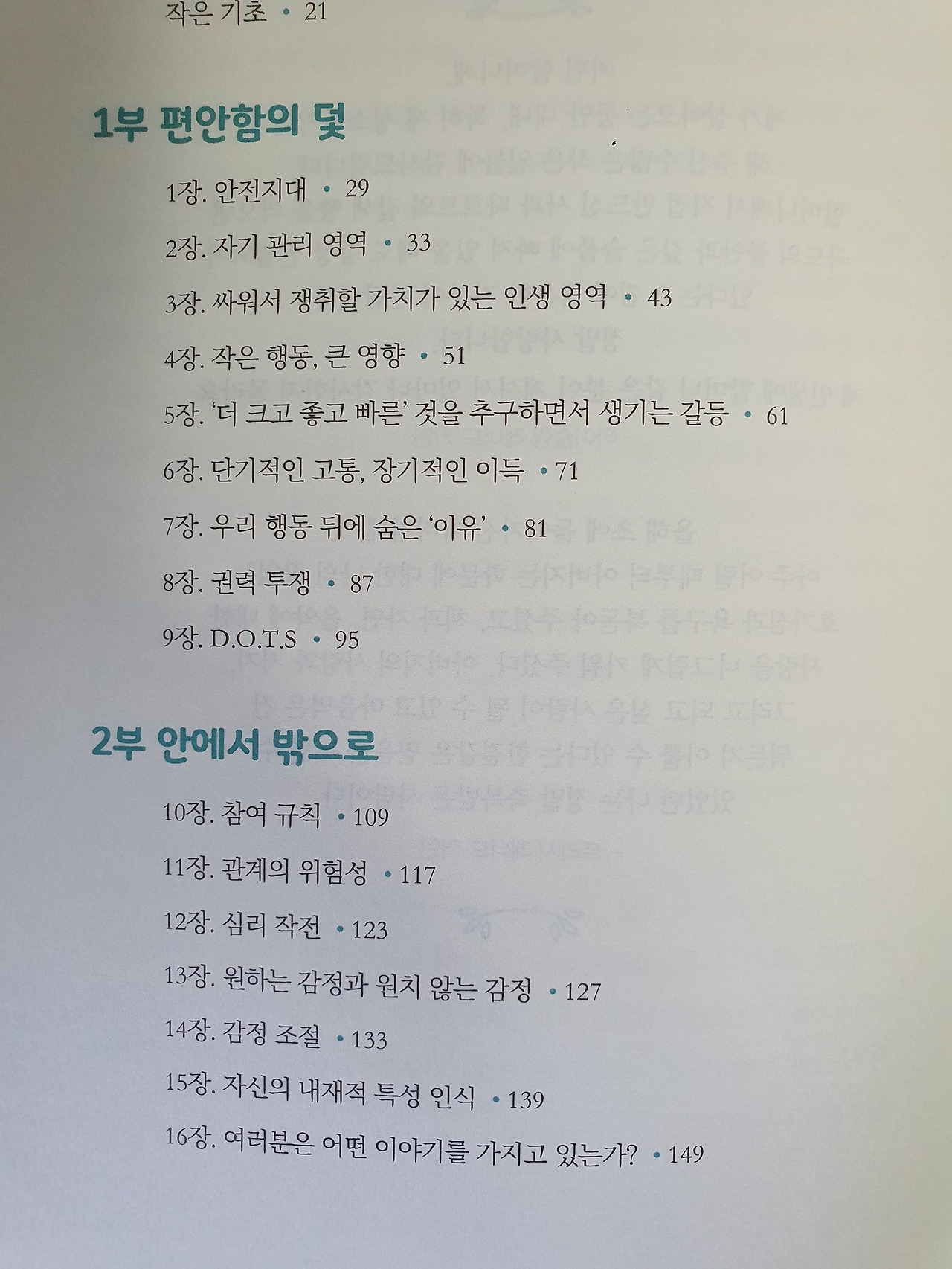 이 책은 전문 상담 심리학자들이 집필해서 매우 현실적이다. 구구절절 설명하는 것보다 목차를 보면 얼마나 유익한 내용들이 많은지 쉽게 알수 있다. 작은 행동으로 큰 결과를 얻기를 진심으로 기원한다.