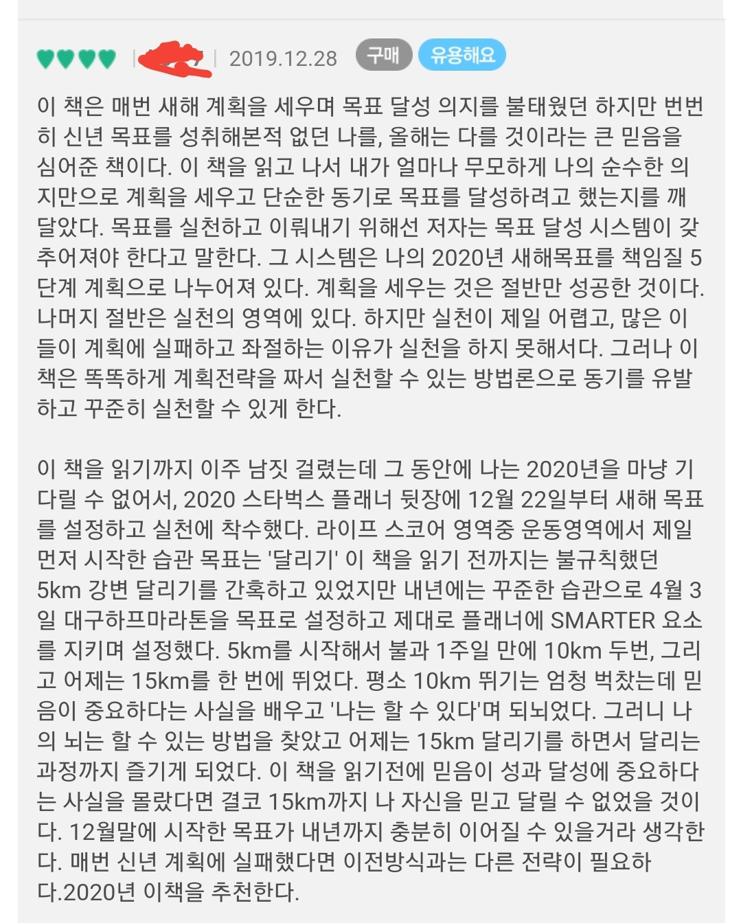 이 책에서 내가 정말 개념적으로 깊게 느꼈던 부분은 목표 설정 구간이다. 안전지대와 망상지대의 중간 사이인 불안 지대가 목표설정을 하기 위한 최적한 구간이라는 부분은 정말 다른 사람에게 목표를 설정할 때 어떻게 해야 하는지 설명해주기 좋은 프레임이었다. 그리고 또 제한적 믿음을 만들어내는 흑백 사고, 개인화, 파국화, 일반화도 그 범주를 적절하게 설정하게 아주 탁월하게 설명하였다. 정말 읽어보면 도움이 많이 될 것이다. 이 책은 국내 리뷰댓글 중에 정말 구체적으로 작성한 분이 있어서 아래 첨부하였다.