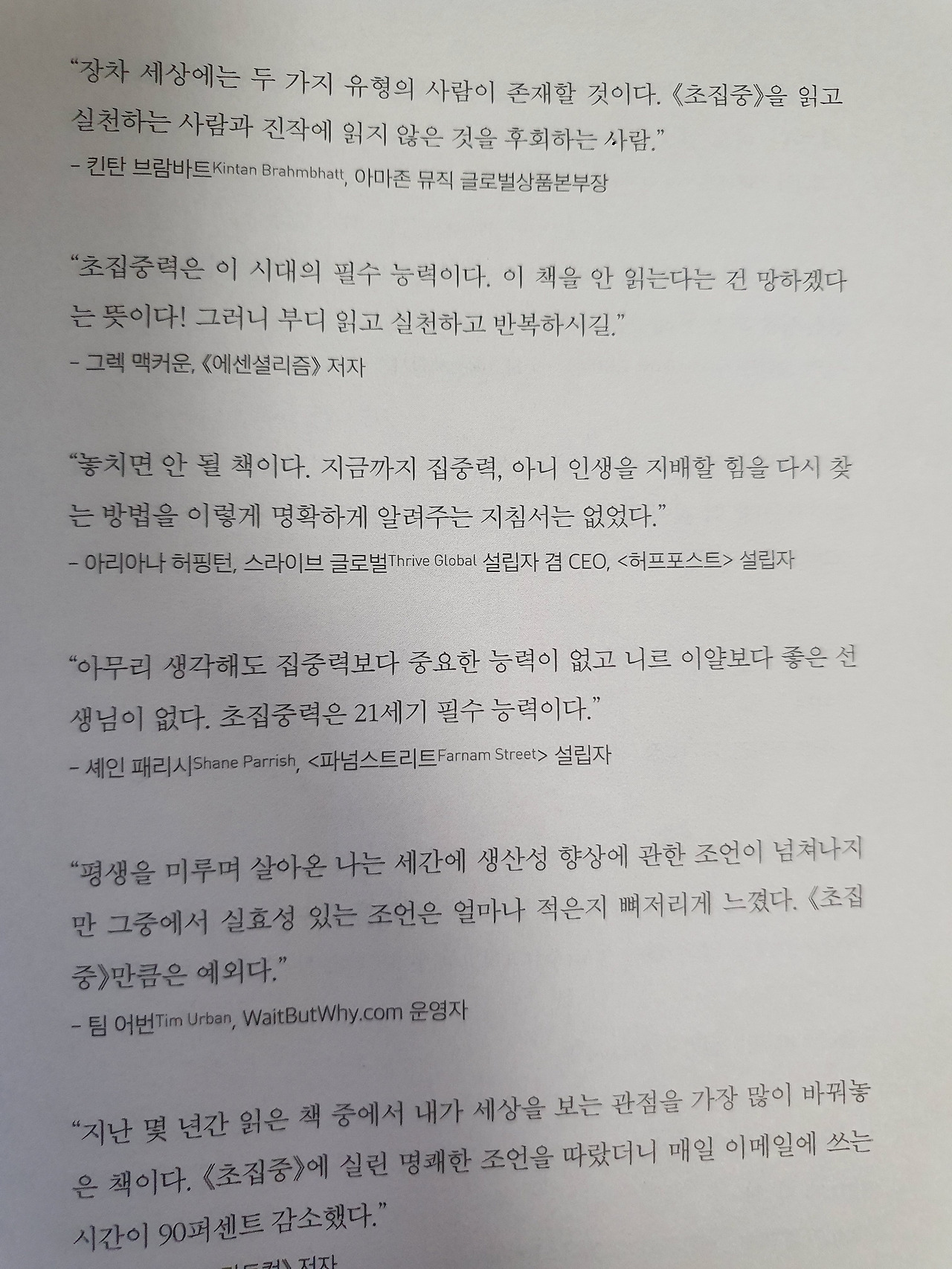 한 번 밖에 없는 인생이다. 그리고 그 인생은 생각보다 짧다. 우리는 집중하면 생각보다 많은 일을 해낼 수 있고, 많은 그것을 느낄 수 있다. 그러기 위해서는 집중해야 한다. 집중하기 위해서는 의지만으로는 충분하지 않다. 우선은 나 자신에 대한 메타인지를 올려야 하고 체계적인 환경설정이 필요하다. 그런 관점에서 <초집중>은 매우 탁월한 책이다. 내면적으로 그리고 외적으로 어떻게 우리가 집중력을 올릴 수 있는 매우 구체적으로 설명해준다. 바로 적용하면 바로 효과가 나는 꿀팁들이 가득하다. 그리고 근본적으로 우리가 어떻게 초집중자가 될 수 있는지 철학적인 질문을 통해 우리를 일깨우기도 한다. 이 책을 정말 많은 사람들이 읽었으면 좋겠다. 누군가가 초집중을 할 수 있다면 그 효과는 주변으로 확산될 것이다. 그렇게 좋은 바이브가 세상으로 퍼져서 이 짧은 인생 모두가 조금이라도 더 알차게 살기를 소망한다.