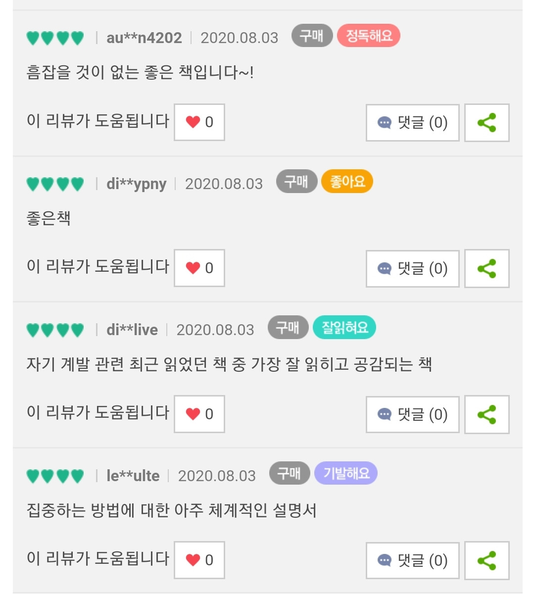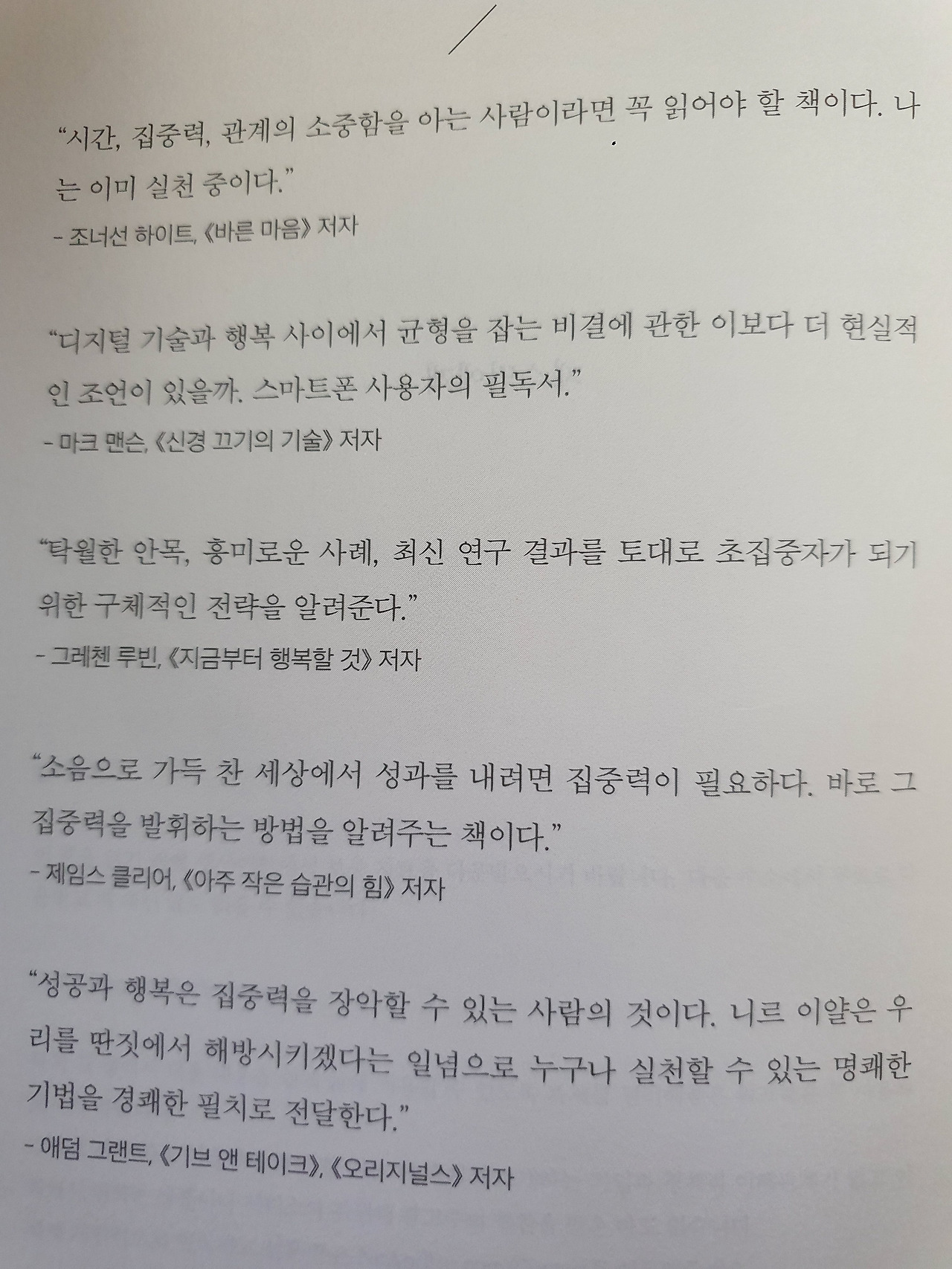 그 이유는 리뷰와 제목에서 직관적으로 설명되는 것 같다. 일단 시간은 돈이다. 집중력이 올라가면 생산성이 올라가는 것은 지극히 자연스러운 일이다. <초집중>은 그렇게 삶의 밀도를 올리고 싶은 사람들의 관심을 많이 받았고, 그리고 읽고나면 책이 군더더기 없이 말 그대로 초집중할 수 있는 실용적이고 실천 각론이 잘 설명되어 있다는 것을 리뷰에서 알수 있다.
