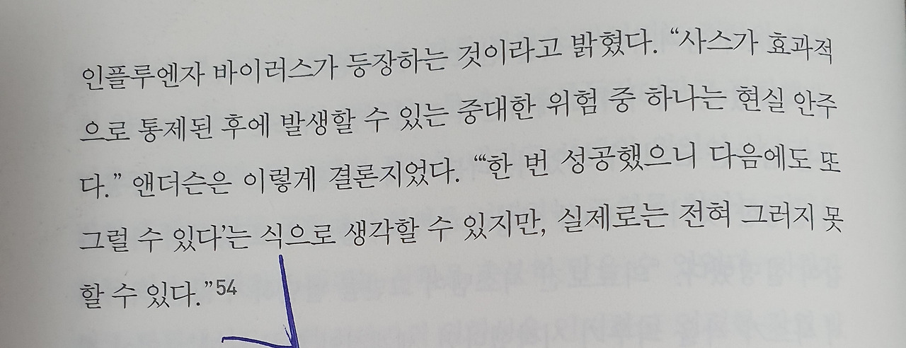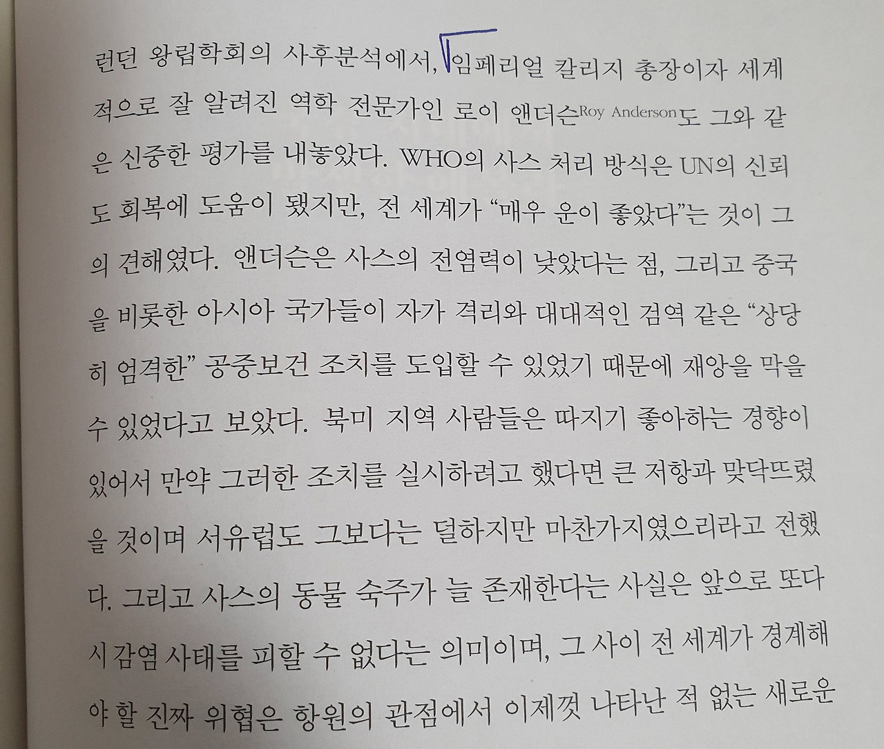 참고로 이 책은 코로나(Covid-19)가 터지기 전에 집필 되었고, 작가가 코로나 상황을 파악한 후 10번째 챕터에 코로나 관련 이야기를 추가해서 신속하게 증보하였다. 이 책을 읽으면서 여러번 소름이 돋았는데 아래 사스 관련 챕터에서는 이번 코로나에 관련해서 완벽한 예언(?)을 이미 전문가들은 하고 있었다는 점에 놀랐다. 그리고 알고 있었음에도 대처하지 못했다는 사실은 더 큰 충격이었다. 마스크 쓰는 것이 개인의 선택이라는 미국 대통령의 말을 보면 아래 인용한 부분이 얼마나 소름돋게 정확한 예측이었는지 알 수 있을 것이다.