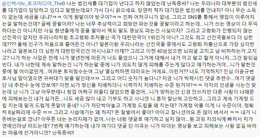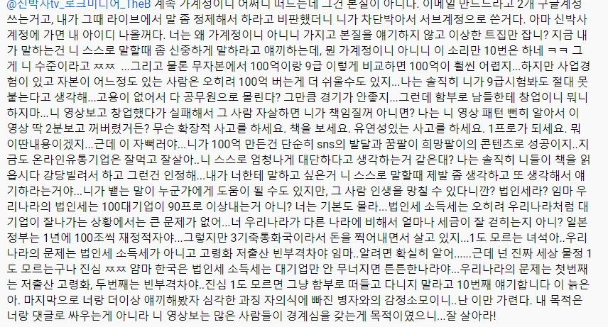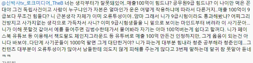 여기서부터는 뭔가 논리적인 척을 하는데 전혀 논리적이지 않다. 그리고 갑자기 뜬금포로 원래 자기가 쓰던 아이디로 바뀐다. 가계정으로 쓰려면 아이디 변경해야되는데 그것을 까먹은 것이다. 그리고 9급 공무원이랑 매출 100억 하는 것이랑 어떤 것이 어려울까? 사실 단순 비교는 어렵다. 그런데 그냥 보편적으로 많은 사람이 100억이 어렵다고 생각하지 않을까? 김범수 드립이 많이 골때렸는데 카카오는 엄청나게 많은 사업을 하고 있고 생각이상으로 트레픽만 있고 매출이 없는 사업도 많다. 모든 기업인은 돈 버는 게 얼마나 어려운지 잘 알고 있다.