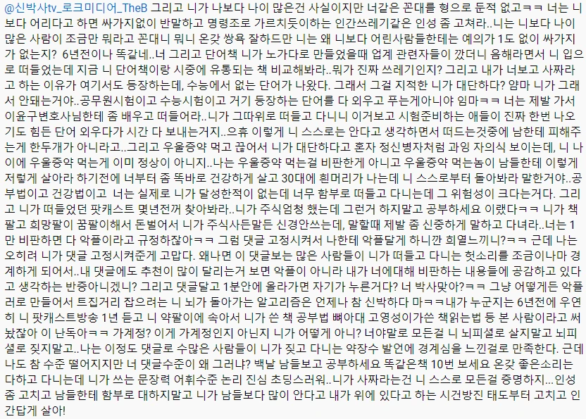 내가 수능 단어의 폐해에 대해서 지적하니 그것을 다 알고 푸는 게 아니라고 한다. 영어를 배우는 목적은 영어를 잘하기 위함 아닌가? 그렇게 영어를 배워서 뭘하려고 하는거지? 사실 이 댓글만 봐도 약간 일베 쪽 아닌가 싶기도 한데.....아니 그러고 유튜브 아이디 클릭하면 생성일 일주일 전이라고 나오고 실수로 본계정으로 아이디 달았으면 가계정인데 이게 그렇게 이해가 안가나? 그리고 우리가 쓴 책 안읽어본 것 같은데.....그리고 내가 건방진거면 글쓴이는 거의 미친 사람 수준아닌가?