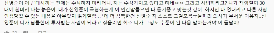 그리고 답변도 해주었다. 난 투자를 받았다고. 그리고 난 주식"투기"하지 말라고 했지 투자를 하지 말라고 한 적은 없다. 심지어 100% 이기는 주식투자라고 영상 찍었다고 악플도 겁나 달렸었다.