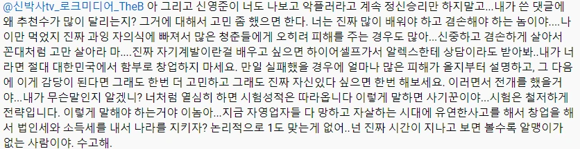 나한테 비판하면 바로 댓글을 지운다고 한다. 당장 여기저기만 해도 비아냥 댓글이 태반이다. 창업해서 망하면 누가 책임지냐고 말한다. 이 사람 기준으로는 우리는 뭘 권유할 수 없다. 책임져야 되기 때문이다. 그리고 뼈아대 읽어봤다면 내가 스타트업의 허상에 대해서도 잘 적어놨는데 책 딱봐도 안읽은 것 같다. 내가 망하지 않는 것을 1원칙으로 둔다는 사실을 기본적으로 전혀 모른다.