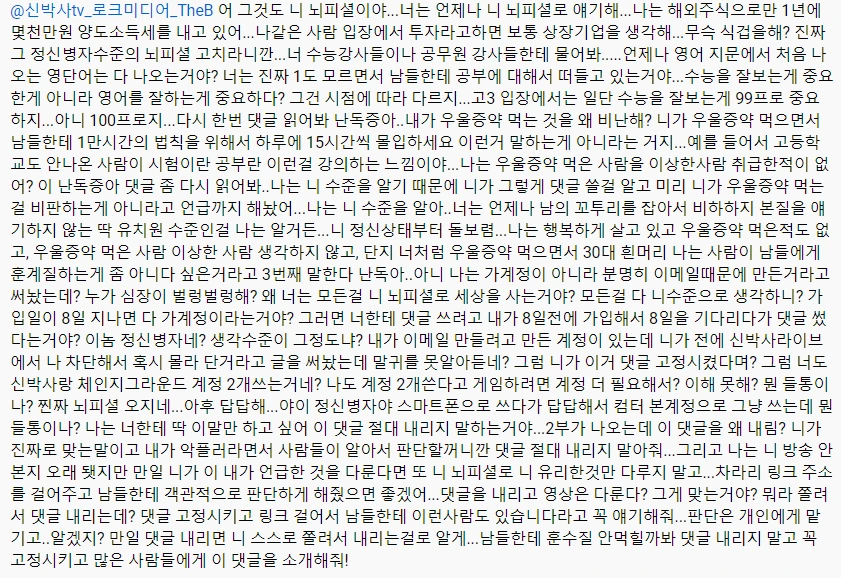 누가봐도 정신과 처방약 먹는 것은 비하했는데.... 그게 이해가 안되나? 나는 계정이 여러 개 있다. 체인지 , 독서연구소, 신박사tv. 이런 것은 가계정이 아니라 다 몇년전에 만든 계정들이다. 보통 가계정은 프로필도 없고 아무 활동도 없고 댓글만 몰래 달려고 만든 계정을 말하는 것이다. 그리고 영어를 잘하면 수능은 잘보게 되어 있다. 개안적으로 토익공부 한 번도 안하고 그냥 대충봐도 950점 나왔다. 그리고 조만간 각잡고 대학붕괴에 대해서 설명해줄 예정이다.