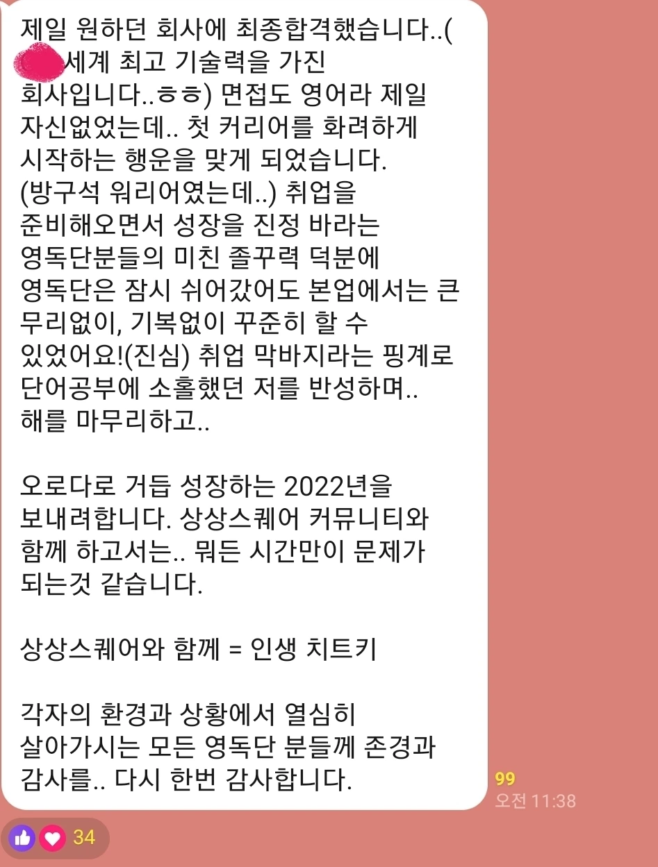 그중에서 유독 자랑하고 싶은 것은 우리가 함께 만든 공동체에서 졸꾸한 분들이 만들어낸 성취들이다. 이것은 내 의지만으로 되는 일이 아니기 때문에 가장 난이도가 높다. 그래서 더욱 자랑스럽다. 오늘은 영어독립_단어 베타서비스 단톡방에 아래와 같은 후기가 올라왔다. 내 아들 취직한 것 마냥 하루 종일 기쁘다.