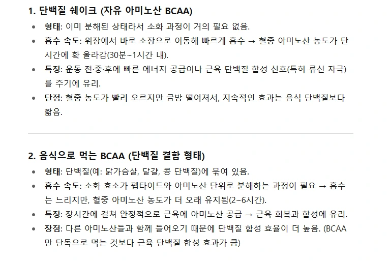 그러면서 관련해서 제가 단백질을 쉐이크로 먹는 경우와 음식으로 먹는 경우 장단점에 대해서 챗지피티 한테 물어보니 역시나 <델쥬아 닭가슴살면>처럼 종합적으로 아미노산이 많이 함유된 음식을 먹는 경우가 여러가지 측면으로 더 좋다는 결과를 확인할 수 있었습니다.