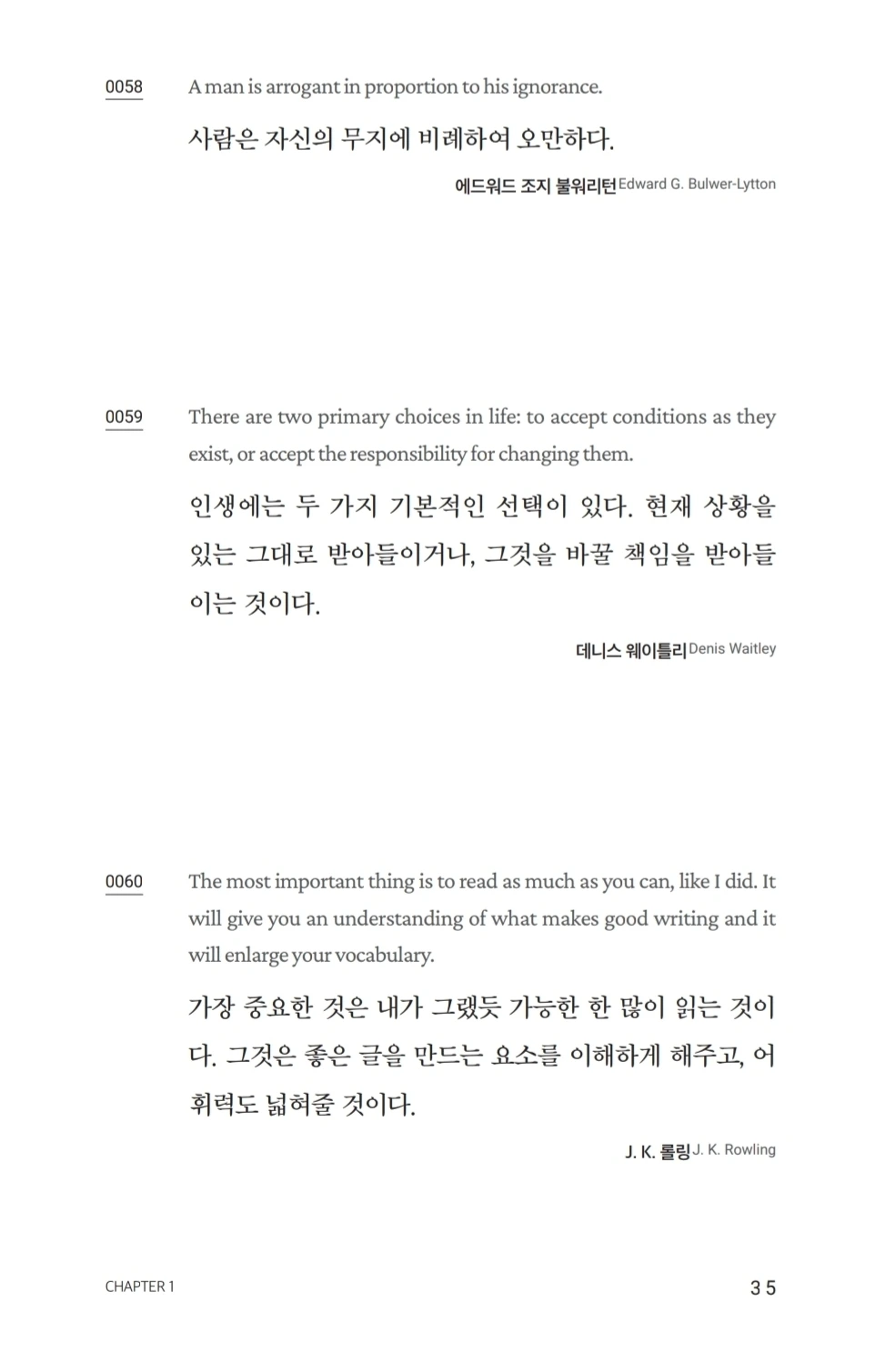 《거인을 읽다》는 명언의 영어 원문과 한글 번역이 같이 있기 때문에 영어 공부를 하기에도 좋은 책입니다. 일단 문장을 통째로 암기하는 것은 가장 효율적인 영어 공부법으로 이미 잘 알려져 있 습니다. 이렇게 공부할 때, 아무 문장이 아닌 내 인생을 바꿀 수 있는 최고의 명언으로 영어 공부를 하게 되면, 그야말로 일거양득의 효과를 누릴 수 있습니다. 번역된 문장으로 읽을 때는 명언을 그냥 빠르게 ‘휙’ 읽고 지나가는 경우가 많지만, 영어로 읽을 때는 의미를 해석해야 하니 단어 하나하나를 꼼꼼하게 곱씹어야 합니다. 이렇게 깊은 독해가 되면서 그 뜻이 영어 공부를 넘어서 인생 공부로 이어지게 됩니다. 사실 명언은 축약되고 함축적인 경우가 많아서 문법의 정점인 경우가 많습니다. 이것도 인공지능에 물어보면 영문학 교수보다도 더 자세히 설명해서, 어떤 문장이라도 이제는 쉽게 이해하면서 영어를 배울 수 있는 시대가 되었습니다. (실제로 《거인을 읽다》를 엮으면서 영어 독해력이 2배 정도 올라간 것 같습니다.)