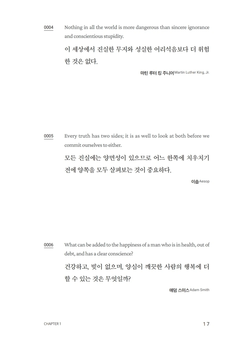 명언은 누군가의 인생 경험일 수도 있고, 사색의 총체적 집약일 수도 있습니다. 그래서 단순히 시간적인, 노력적인 측면만 고려해도, 하나의 명언을 완벽하게 체화할 수 있다면 거기서 얻는 가치는 계산이 되지 않을 정도로 거대합니다. 살면서 인생의 기준으로 세울 수 있는 완전히 체득한 명언 하나만 있어도, 중요한 의사결정을 내릴 때 후회 없이 단단한 결정을 내릴 수도 있고, 혼란스러 운 시기에 그 명언 하나 덕분에 많은 것을 극복할 수도 있습니다. 많은 분들이 《거인을 읽다》를 통해 자신만의 인생 기준과 정답을 찾는 데 많은 도움을 받으실 것입니다.