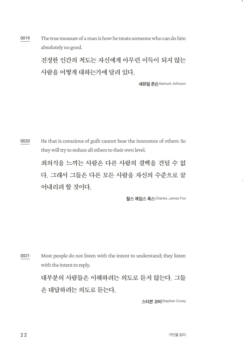 《거인을 읽다》는 다양한 방법으로 읽을 수 있습니다. 먼저 거인의 통찰을 아주 천천히 곱씹어 보면서 읽는 것을 추천합니다. 다른 책과 달리 이 책은 빨리 읽어야 하거나, 읽는 진도를 빼야 한다는 강박을 가지고 읽을 필요가 전혀 없는 책입니다. 앞에서 말씀드린 것처럼 단 하나의 명언만 체화하더라도 인생이 바뀌는 경험을 하실 수 있습니다. 그리고 이 책은 여백이 많습니다. 그 여백에 필사하셔도 좋고, 자신만의 생각이나 느낀 점을 써보면서 읽으시면, 읽는 효과가 배가 될 것입니다. 그렇게 여러분의 생각이 메모로 들어간 책은 완전히 새로운 책이 될 수 있습니다. 그 책은 여러분이 소중하게 생각하는 누군가를 위해 아주 특별한 선물이 될 것입니다. 《거인을 읽다》는 필사에 최적화된 책입니다. 1400 개의 명언 중에서 여러분이 가장 의미 있다고 생각하는 명언 100 개, 200개, 300개 이런 식으로 따로 뽑아서 다른 노트에 필사하시 면 자신만의 새로운 책을 만들 수 있습니다. 그리고 간곡히 권하는 방법 중에 하나는 영어 문장을 필사하는 것입니다. 영어 문장 필사는 《거인을 읽다》의 통찰과 지혜를 흡수하는 가장 완벽한 방 법입니다. 영어로 의미를 이해하려면 한 단어도 허투루 넘어갈 수 없으므로 시대를 관통하는 거인의 가르침을 더 제대로 전수받을 수 있습니다.