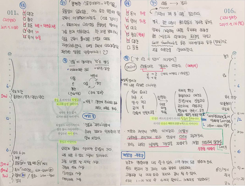 그러다 조금 방향을 바꾸게 된다. 무료 멘토링 프로젝트를 진행하게 되었다. 3개월 동안 프로젝트를 진행하면서 놀란 점은 생각보다 많은 친구들이 자신의 메타인지를 높이기 위해 하는 데일리 리포트 작성을 꾸준하게 해내지 못했다. 그리고 수 많은 친구들이 24시간을 기록한 데일리 리포트를 나에게 보냈지만 대부분이 실패하였는데 100일 이상 보낸 친구들에게 공통점이 있었다. 신기하게 리포트를 종이에 적고 사진을 찍어서 보낸 친구들이 대부분 끝까지 오래 기록을 하였다. 사실 그 이유는 모르겠지만 추정하기로는 어떤 결과물을 남기는 성취감이 더 크지 않았을까하고 추측을 해본다.