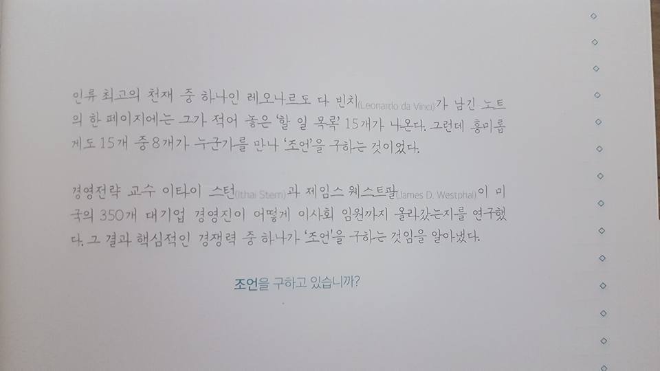 조언을 구하는 것은 상당히 중요하다. 하지만 대부분이 이런 저런 이유로 조언을 구하지 않는다. 일단 나한테 고민 메일이 쏟아지는 걸 보니 가까운 사람한테 자신의 부족한 점을 이야기한다는 것이 쉬운 일은 아닌가 보다. 또 막상 주변에 고민을을 구할 때가 없는 경우도 많다. 사실 이게 중요한 부분이다. 아무나한테 고민을 구하는 것은 잘못된 지도로 여행을 시작하는 것과 같다. 여행 망칠수도 있다.