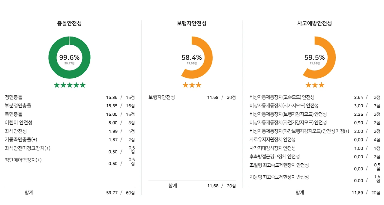 충돌안전성 : 정면충돌, 부분정면충돌, 측면충돌 등 8개 충돌 관련 탑승자 안전성을 평가
