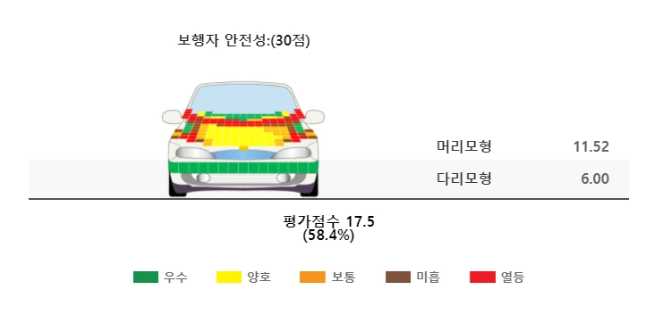먼저 보행자 안전성 평가에 대한 부분을 살펴보고자 한다. 보행자 안전성 평가에서 다리 모형은 모델3와 아이오닉5 모두 6점으로 동일한 점수를 획득했다. 다만, 머리 모형에 대한 보닛 충돌 시험에서 모델3가 11.52점으로 과락을 하게 되었다. (아이오닉5는 14.46점)