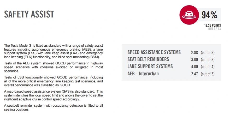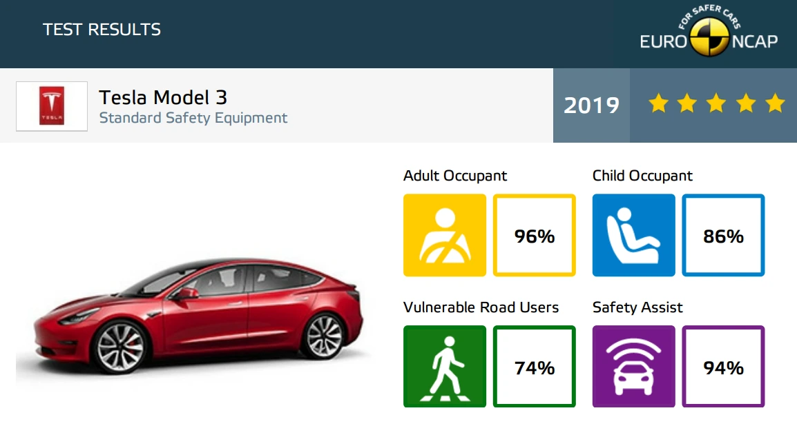 EU와 호주의 안전성 평가에서 모델3는 보행자 안전성(vulnerable road users, 해당 평가 기준 중에 머리모형 충돌 시험결과가 있음)과 주행안전 보조(safety assist, 해당 평가 기준 중에 2021년 KNCAP 모델3에 대한 사고예방안전성 중 논란이 되었던 자전거 탑승자 비상제동장치 작동과 차로유지지원장치에 대한 내용이 담겨있음)에 대한 부분에서 각각 74%와 94%의 점수를 확보하였고, 테스트 종합결과로 별 5개로 최고등급을 획득하였다.