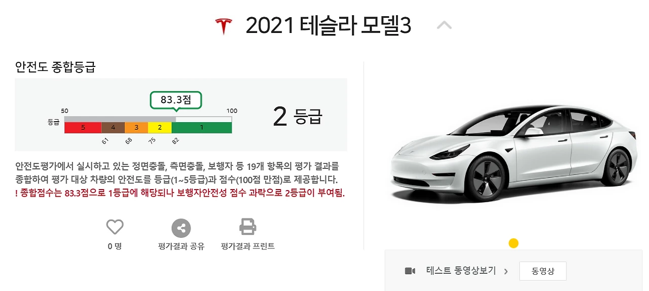 2021년 8월, 국토교통부 산하 한국교통안전공단 자동차안전연구원에서 시행한 2021년 자동차안전도평가(KNCAP) 결과에서, 현대자동차의 아이오닉5이 1등급, 테슬라 모델3가 2등급을 받으면서 인터넷 커뮤니티와 자동차 관련 유튜브들을 중심으로 뜨거운 관심이 모아졌다.