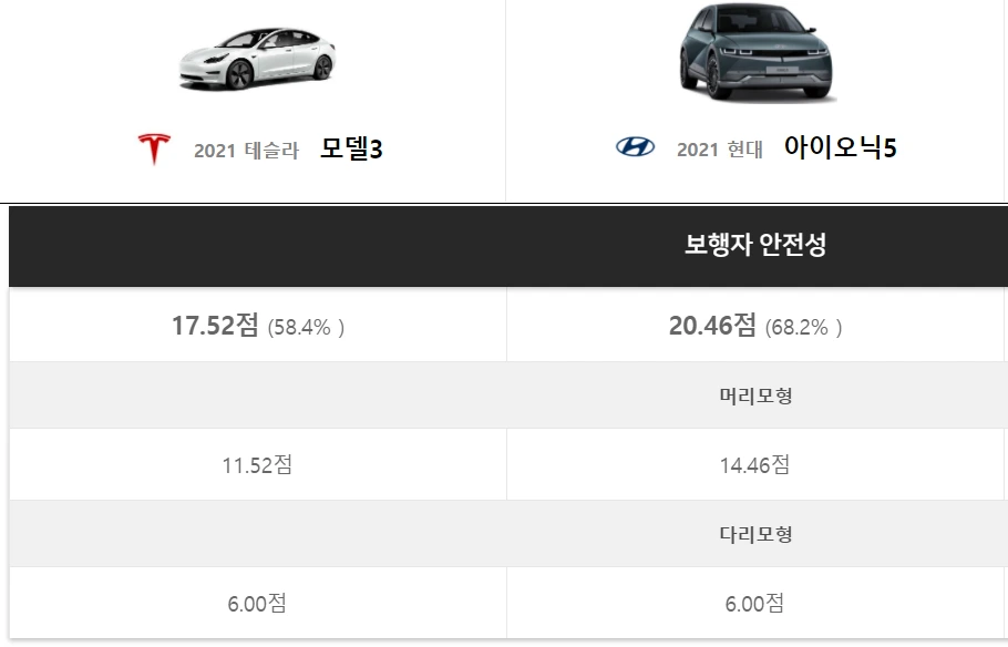 2021 KNCAP 모델3와 아이오닉5의 보행자안전성평가 결과
