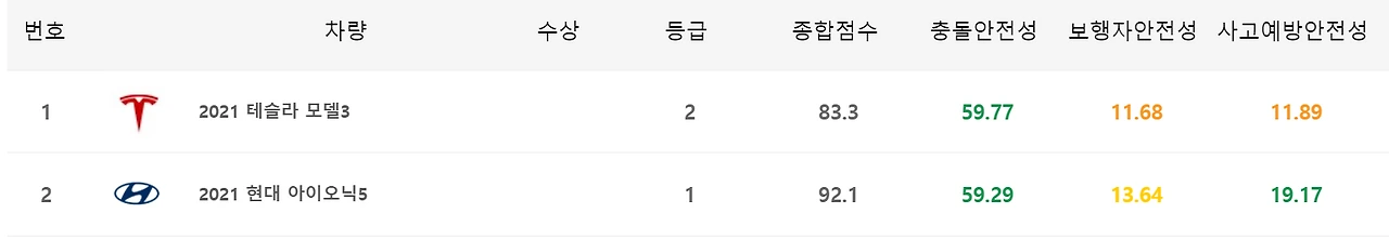 KNCAP 2021 테슬라 모델3와 현대 아이오닉5 결과 요약표 (출처: 한국자동차안전연구원 KNCAP 홈페이지)