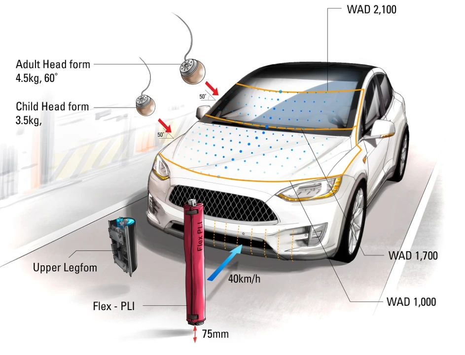 정면충돌 시험 사진. 충돌시험은 자동차 안전성 시험평가 관련 영상 자료로 많이 쓰인다.보행자안전성 : 보행자의 머리와 다리가 차량 전면의 유리창과 본닛, 범퍼에 충돌 시 보행자 안전성을 평가