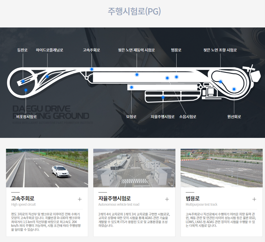 지능형자동차부품진흥원(KIAPI)는 차세대 자동차 기술을 개발하는 기업과 연구 기관을 지원하기 위해 2014년에 설립된 전문 시험 기관이다. 이곳에서는 자율주행 차량을 비롯해 전기 및 하이브리드 차량 같은 차세대 자동차 개발을 위한 실차 평가와 시험 시설을 제공하고 있다. 고속 주행로와 범용 시험로를 포함한 다양한 조건의 주행 시험을 지원하며, 샤시 다이나모와 충격 내구성 시험 장비 등을 갖추고 있어 다양한 테스트를 수행할 수 있다. 특히, 무선통신망(WAVE)을 활용한 지능형 주행 및 관련 시험이 가능한 시험 도로 체계를 구축했다.