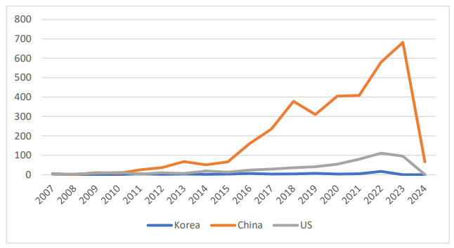 2007년부터 2024년까지의 특허 출원 현황을 보면, 한국은 2022년에 두드러진 증가를 보였고, 중국은 지속적으로 특허 출원이 증가하다가 2023년에 정점을 찍고 2024년에 급감하였다. 미국은 2022년에 정점을 찍은 후, 이후 몇 년간 감소하는 추세를 보였다.