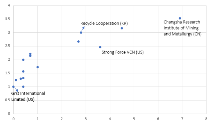 기술 키워드 분석에서는 세 나라 모두 배터리 재활용 기술(H01M-010)에 중점을 두고 있음을 알 수 있다. 한국과 중국은 금속 추출 및 소재 준비 공정에, 미국은 지능형 제어 시스템 및 데이터 관리에 큰 관심을 보였다.