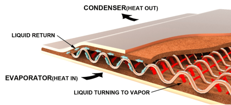 이러한 발열 문제 해결을 위해 여러 접근법이 사용되고 있습니다. 이번에 삼성에서는 베이퍼 챔버(vapor chamber)라는 기술적 접근을 들고 왔습니다. 베이퍼(vapor)라는 단어는 증기를 의미합니다. 여기서는 하나의 비유로 생각해주시며 좋을 것 같습니다. 쉽게 말해 냉매가 순환하면서 열을 들고가주는(뺏어가주는) 원리라고 볼 수 있습니다. 아래 그림들을 보시면 조금 더 이해가 용이하실 수 있습니다.