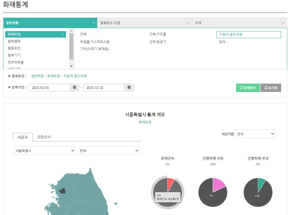 참고로 소방청 국가화재정보시스템을 통해서도 1년 단위로 각 화재유형별 화재통계를 검색할 수 있다.