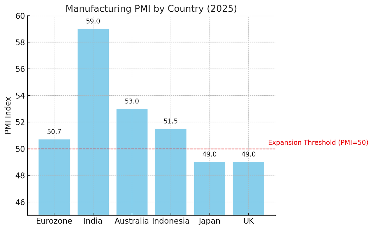유로존은 50.7을 기록하며 3년 만에 다시 확장 국면으로 진입했습니다. 인도는 59.0으로 가장 높은 수치를 기록해 세계에서 가장 활발한 제조업 확장세를 보이고 있습니다. 호주(53.0)와 인도네시아(51.5)도 확장 국면을 유지하며 안정적인 회복세를 이어가고 있습니다. 반면 일본과 영국은 각각 49.0으로 여전히 50을 밑돌아 경기 위축 국면에 머물러 있음을 보여줍니다.