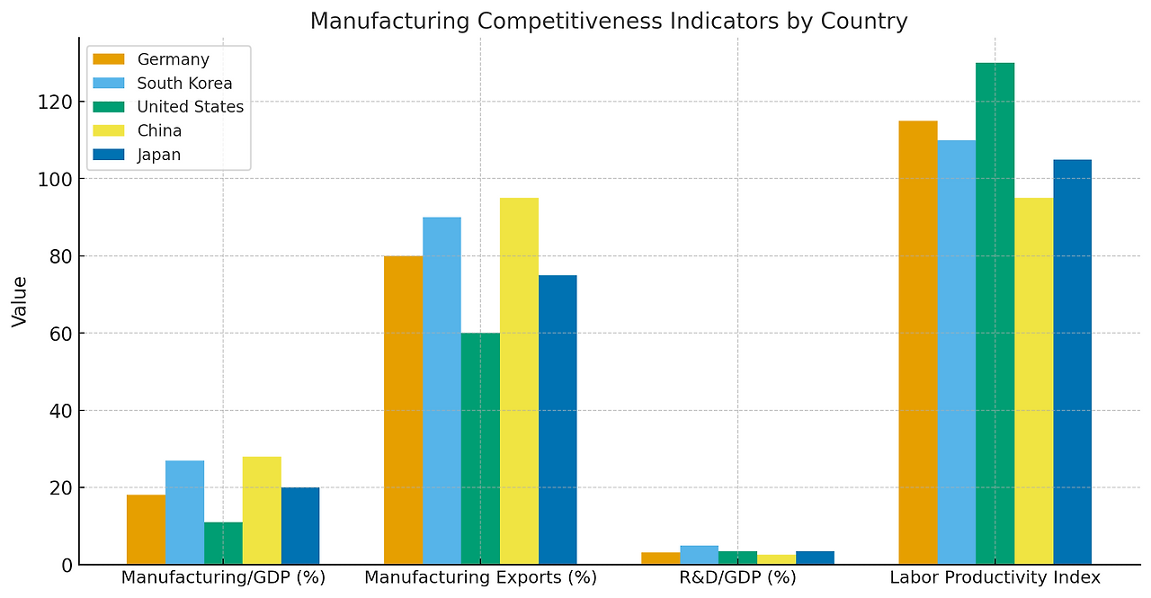 정리해보면, 한국과 중국은 제조업 비중과 수출 의존도가 높고, 미국은 노동생산성과 혁신 역량에서 두각을 나타내며, 독일과 일본은 균형 잡힌 제조업 강국의 면모를 보여줍니다. 이 지표들은 제조업 경쟁력이 단순히 GDP 비중이 아니라 수출, R&D, 생산성의 종합적 결합으로 형성된다는 점을 잘 보여줍니다.