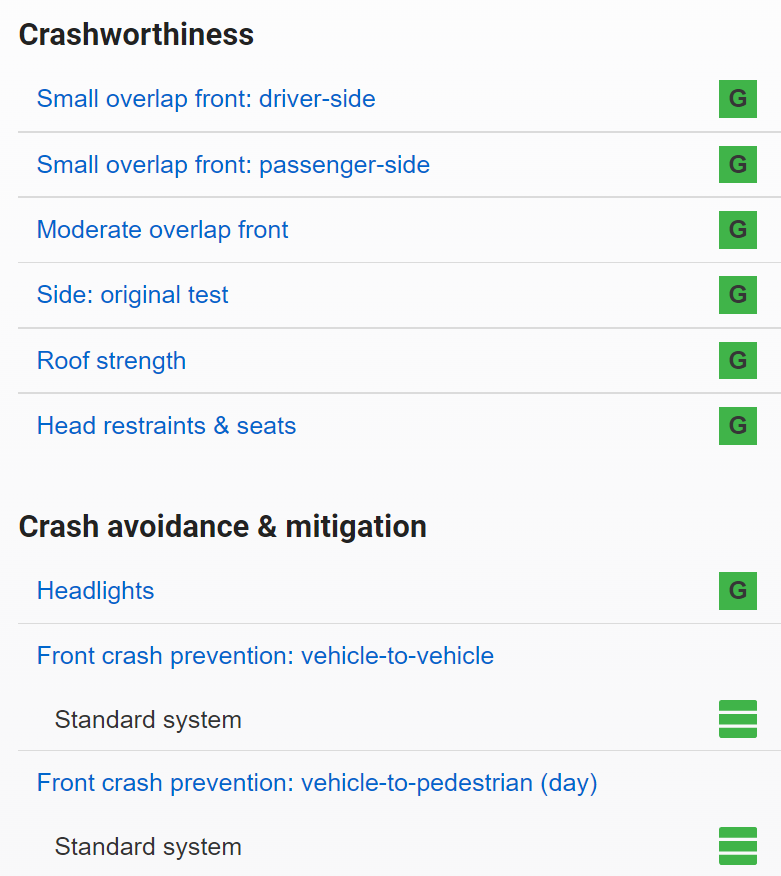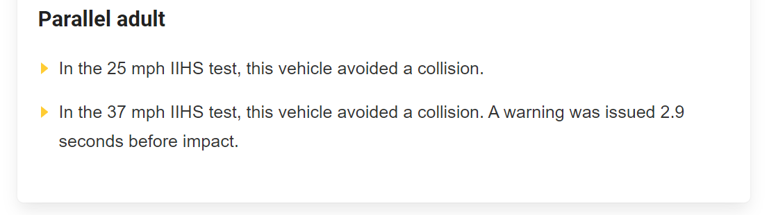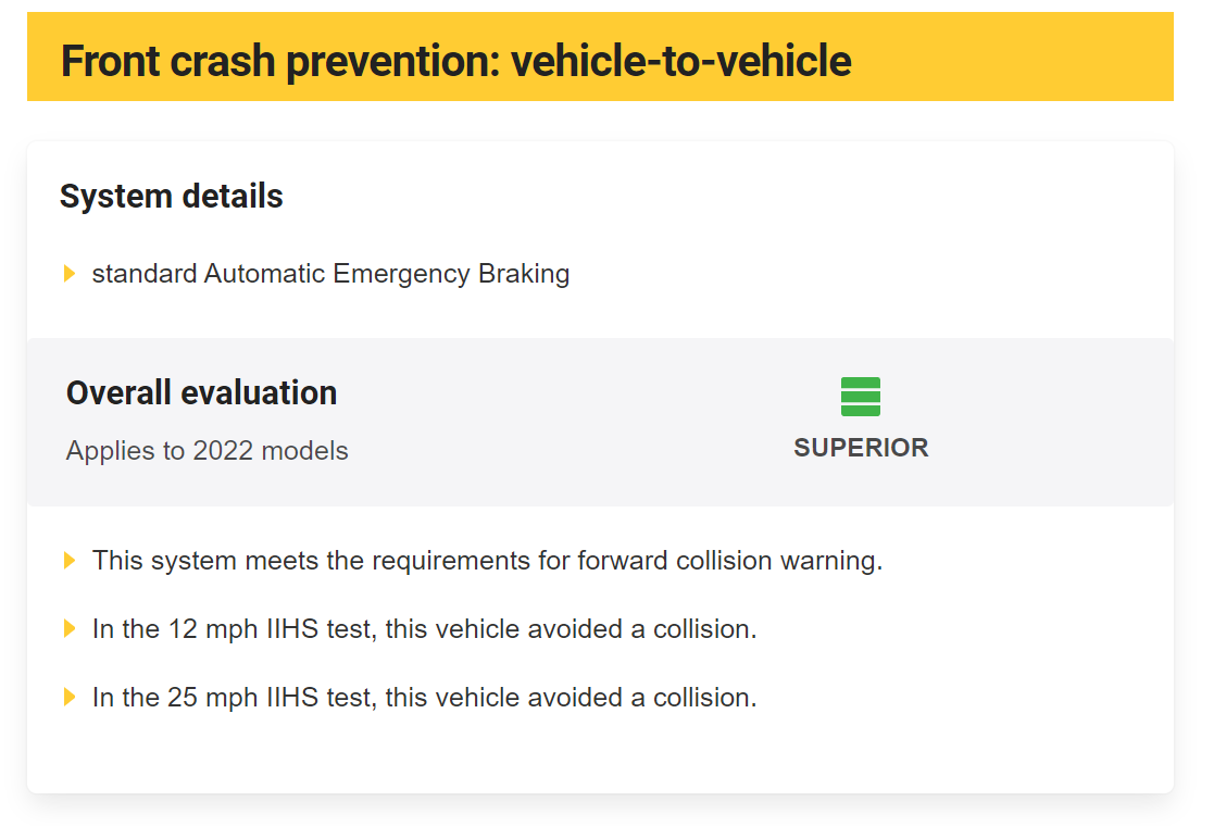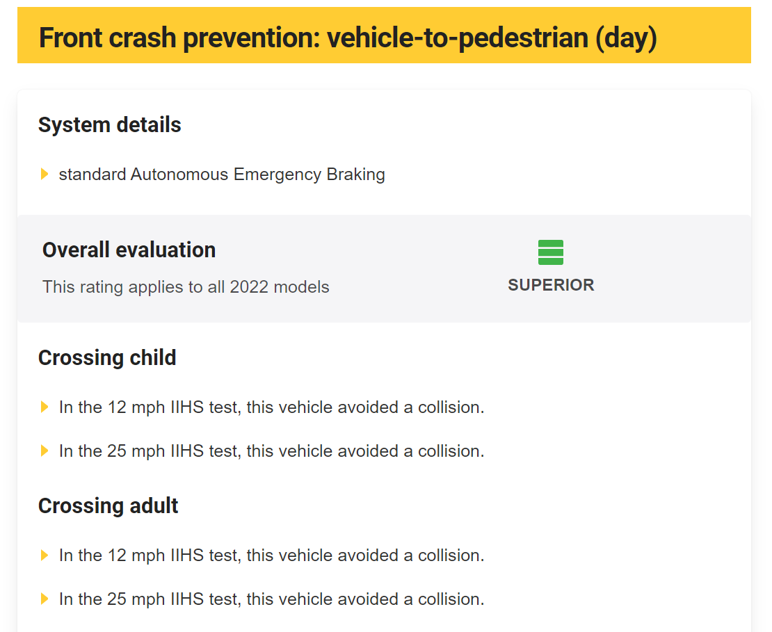 전방 충돌 방지에 있어 가장 중요한 부분 중 하나는 차량이 보행자를 치지 않도록 정차하는 것이다. IIHS에서는 낮시간에 차량-보행자 간 전방 충돌 방지 시스템을 체크한다. 2022년 생산 모델에 대한 이번 평가에서 차량과 90도 각도에서 길을 건너는 어린이와 성인을 대상으로 시속 40km에서도 안전하게 정차하였으며, 차량 진행방향과 동일한 방향에 있는 성인에 대해서도 시속 60km(시속 37마일)에서도 안전하게 정차하였다.