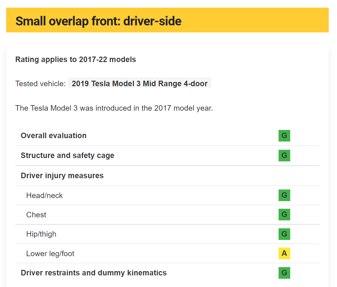 운전자석 충돌 평가에 있어서도 2021년과 마찬가지로 2022년에도 동일한 2019년식 모델3로 평가를 진행했을 때, 다른 항목들은 좋음(good)으로 나타났고, 다만 운전자 부상 측정에 있어 다리 하단과 발 부분이 최고 높은 점수인 좋음(good)이 아닌, 그보다 한 단계 낮은 수용 가능함(acceptable)로 나타났다. 이 평가 결과 역시 2021년과 동일하게 2022년에도 나타난 부분이다.