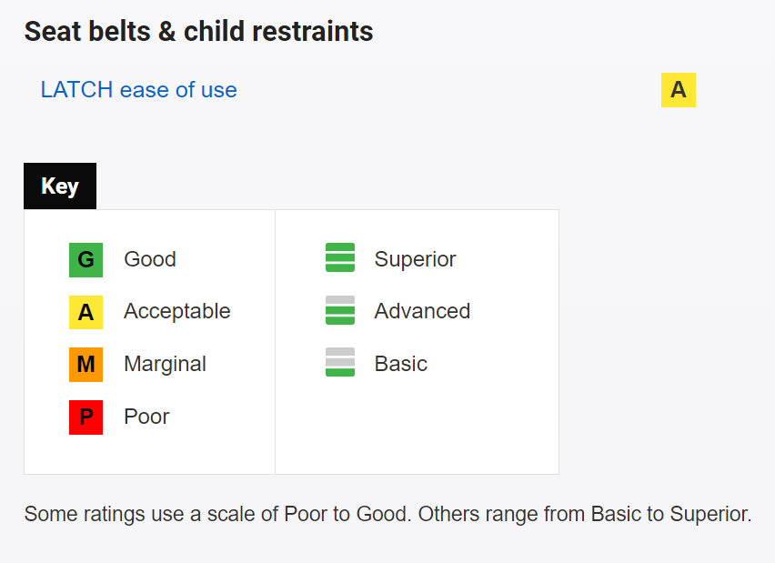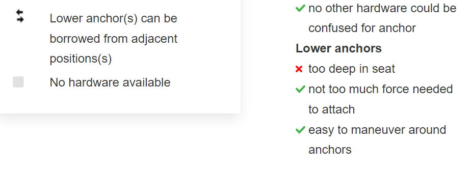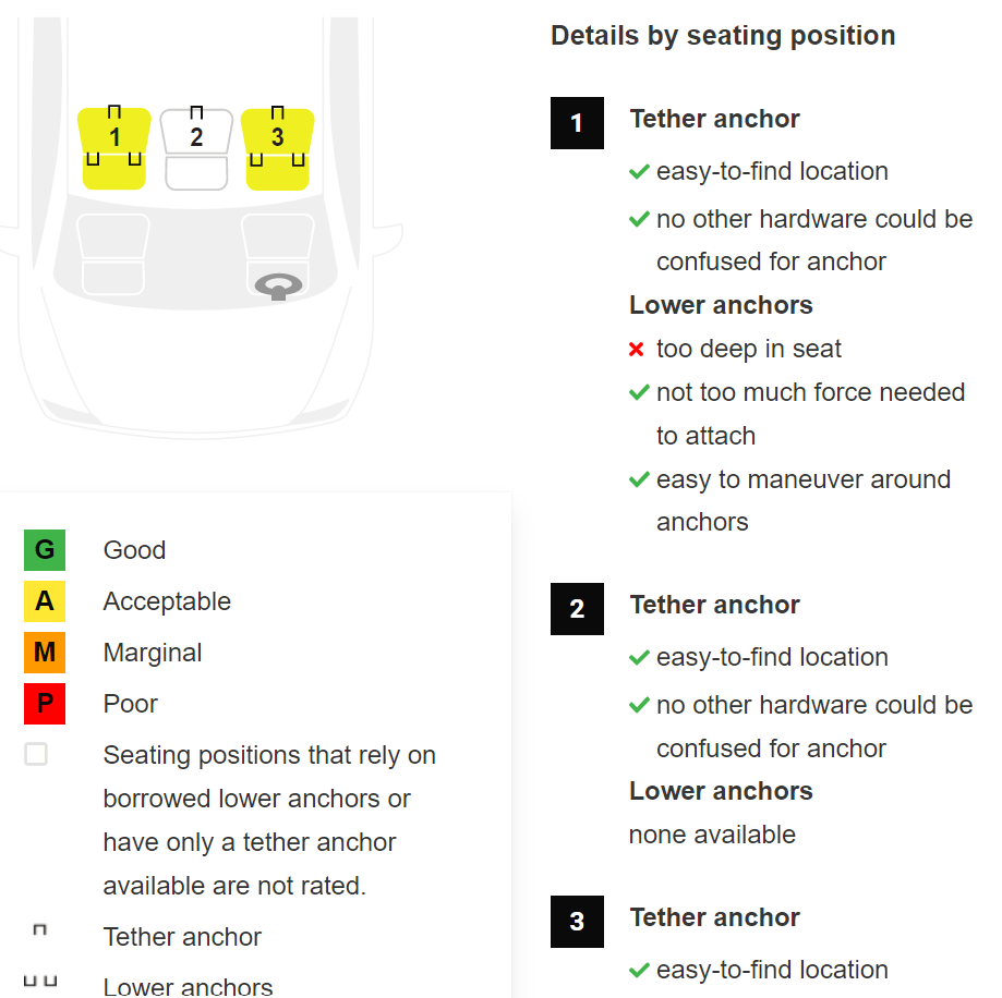 마지막으로 안전벨트 관련한 평가 내용이다. 이 부분 역시 2021년과 동일하게 2022년 평가에서도 운전석과 조수석의 바로 뒷자리들이 최상 등급이 아닌 두번째로 높은 등급인 수용가능함(acceptable)을 받았다. 주요 지적사항을 살펴보면, 결국 안전벨트와 관련해서 어린이 안전을 위해 유아 시트를 부착하는 상황을 가정하여 평가가 진행된다. 이때, 좌석 상단에 있는 고정축(tether anchor)는 눈에 잘 띄나, 자리 하단의 의자가 접히는 부분에 위치한 하단 고정축 2개(lower anchors)가 좌석 너무 안쪽에 있다는 지적사항이 있었다. 이 부분에 대해서는 추후 테슬라에서 설계상 개선이 필요한 부분이다.