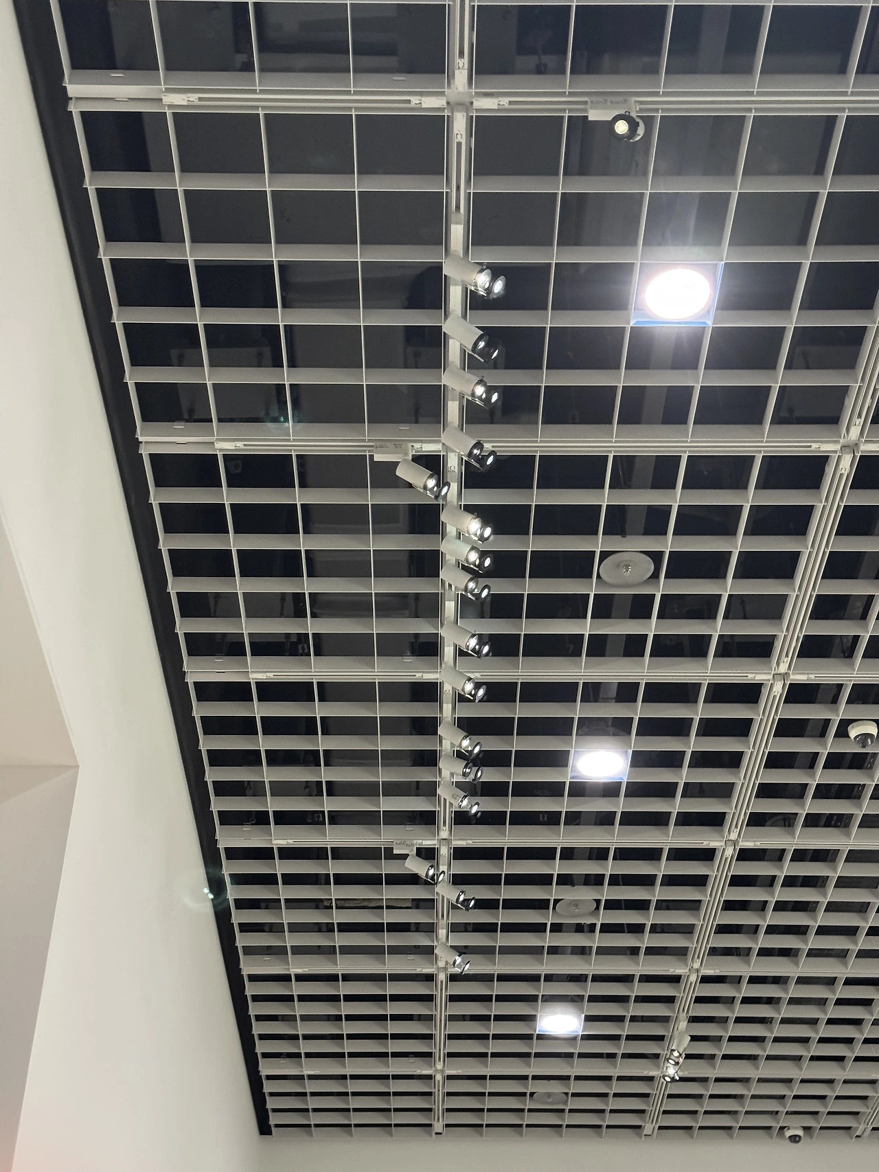 지하에 위치한 전시공간으로 내려가면 아래 사진의 장면을 마주하게 된다. 흰 벽에 은은하게 빛나며 소개되어 있는 이번 전시의 타이틀을 가만히 들여다보면 마치 벽에 투사된 대형 프로젝션인가 싶은 착각이 든다. 하지만 천장을 자세히 보시면 저 타이틀을 비추기 위하여 수많은 스포트라이트 조명들이 배치되어 있음을 알 수 있다.