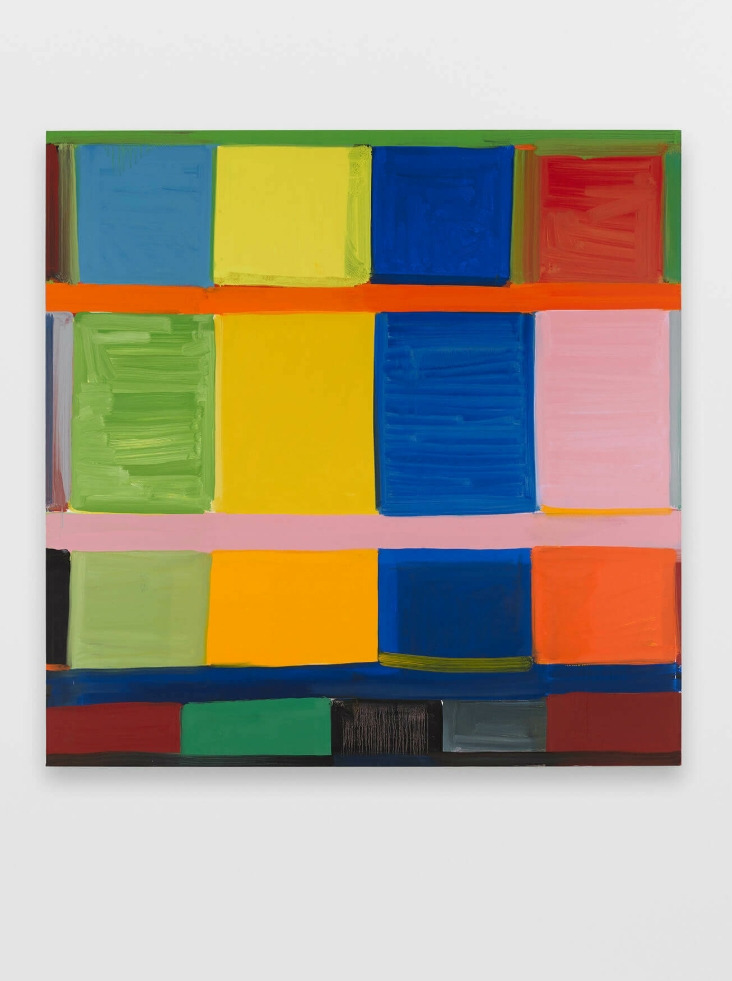 휘트니는 "공간은 색 안에 있다"라고 말한다. 느슨한 격자(grid) 속 각 칸에 색채 블록들을 즉흥적으로 쌓아 올리며 자연스럽게 생겨나는 색의 경계와 겹침, 번짐 등의 효과를 통해 캔버스에 전체적으로 공간적인 깊이와 리듬을 형성한다. 아래의 'Yellow Changing'을 보고 있으면 아모레퍼시픽 용산 사옥의 야경이 자연스럽게 떠오른다. 크게 네 덩어리를 쌓아 올린 듯한 건물의 구성과 사이사이에 크게 비워져 있는 공간들이 만들어내는 깊이감. 그리고 실내조명이 켜있는 영역과 그렇지 않은 영역이 무작위로 만들어내는 빛의 패턴과 색감은 마치 휘트니의 작업이 3차원적으로 재구성된 느낌을 준다.