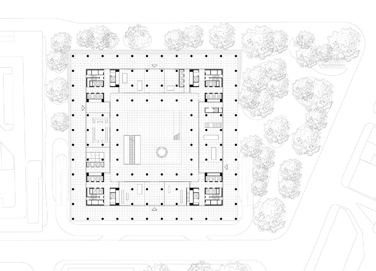 아모레퍼시픽 용산 사옥의 평면은 휘트니의 격자(grid) 보다 더욱 엄격하게 구성되어 있다. 바닥의 경우 90m X 90m의 사각형 틀 안에 8.1m 간격으로 배치된 기둥, 또 이 8.1m 간격을 6 등분하는 정사각형 포천석 마감으로 구성되어 마치 모눈종이를 보는 듯 끊임없는 반복과 대칭을 이루고 있다. 하지만 지상 1층 평면도를 보면, 이러한 규칙 속에서 콘크리트와 유리 벽체를 활용하여 건물의 기능적인 영역을 구분하기도, 유기적으로 연결하기도 한다. 두꺼운 까만 선(콘크리트)으로 둘러싸인 공간에는 회사 직원들이 상부의 업무공간으로 올라갈 수 있는 엘리베이터와 계단들이, 얇은 선(유리)으로 둘러싸인 공간에는 직원과 시민 모두에게 개방된 로비와 상업시설들이 배치되어 있다. 이렇게 도면에서 보이는 엄격한 틀 안에서의 공간 배치는 휘트니 회화 작업의 구성이 주는 느낌과 상당히 닮아있다.