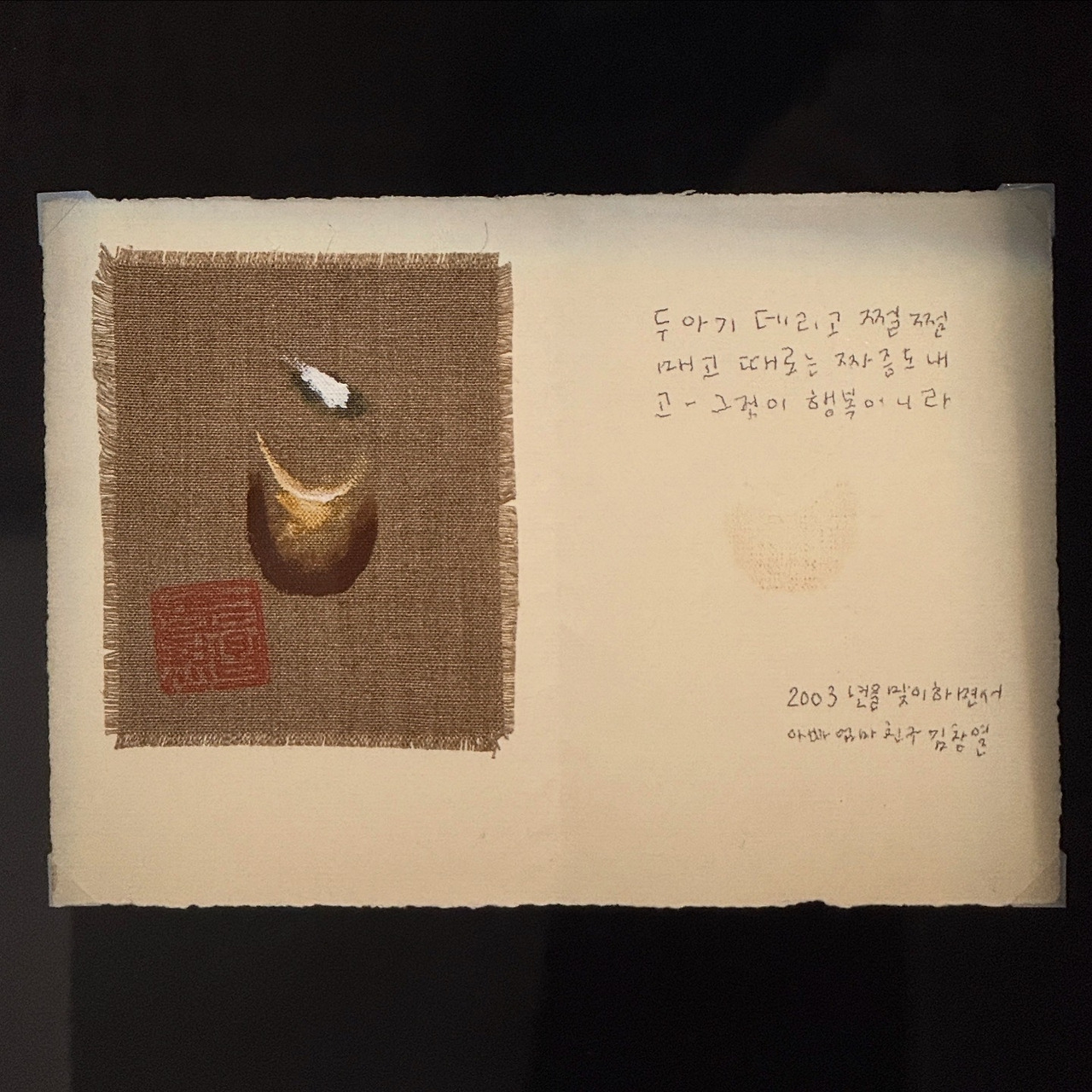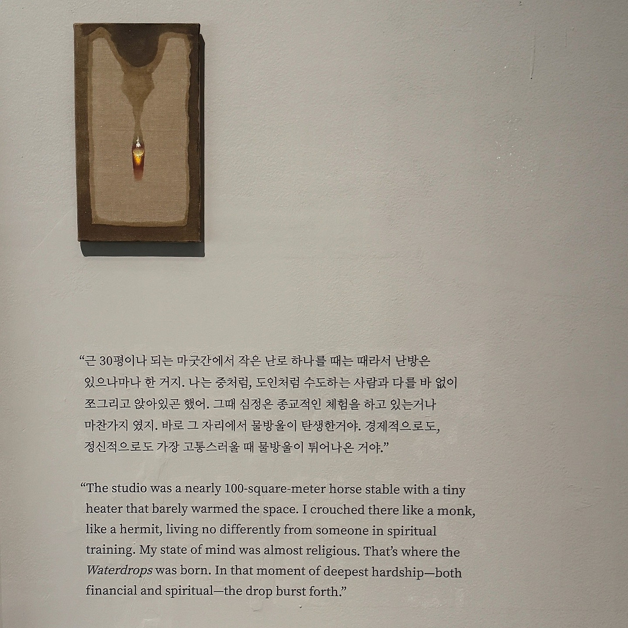 물방울을 예쁘게 잘 그리는 분 정도로만 알고 있었던 김창열 작가 평생의 흔적을 조금이나마 이해할 수 있었던 뜻깊은 전시. 물방울 작업이 튀어나오기 전까지 수없이 스터디하며 디벨롭된 구성의 흔적들. 돌아보니 삶은 기적의 연속이었다는 작가의 마음을 어찌 다 헤아릴 수 있을까. 아름다운 작품들 너머 작가의 가슴 절절한 이야기들에 마음이 아팠다가, 전시의 끝자락에 놓인 '두 아기 데리고 쩔쩔매고 때로는 짜증도 내고 - 그것이 행복이니라'라는 작가의 글에 난 참 행복한 사람이라는 생각을 하며 미술관을 나올 수 있었다. 언제 그랬냐는 듯 비도 싹 그쳐있었다.