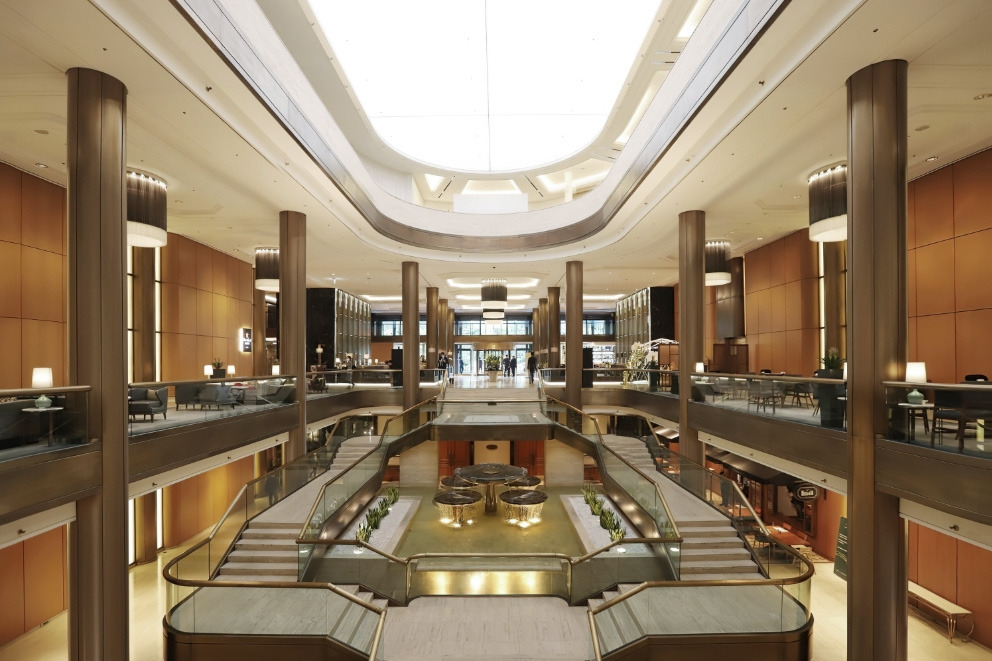 밀레니엄 힐튼 서울의 가장 대표적인 공간은 18m 높이의 로비 아트리움이다. 지하 2층에서 지상 1층까지 수직으로 트인 이 공간은 천창으로 자연광을 받아들이며, 내부 분수와 조경을 활용하여 도시 안의 ‘개방된 정원’을 구현했다. 이는 당시 한국 호텔 구조의 상업적 폐쇄성과 대조되는 혁신적인 시도였다.