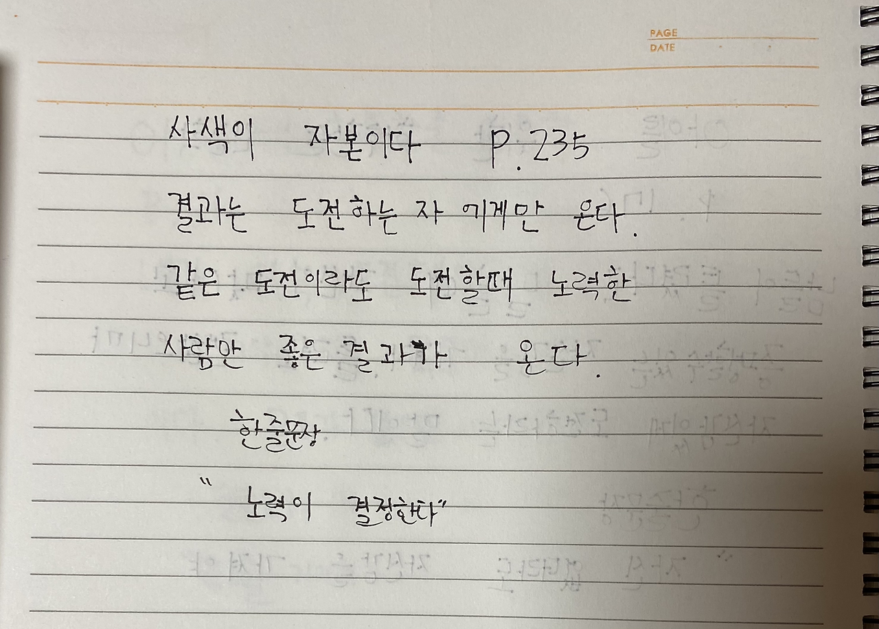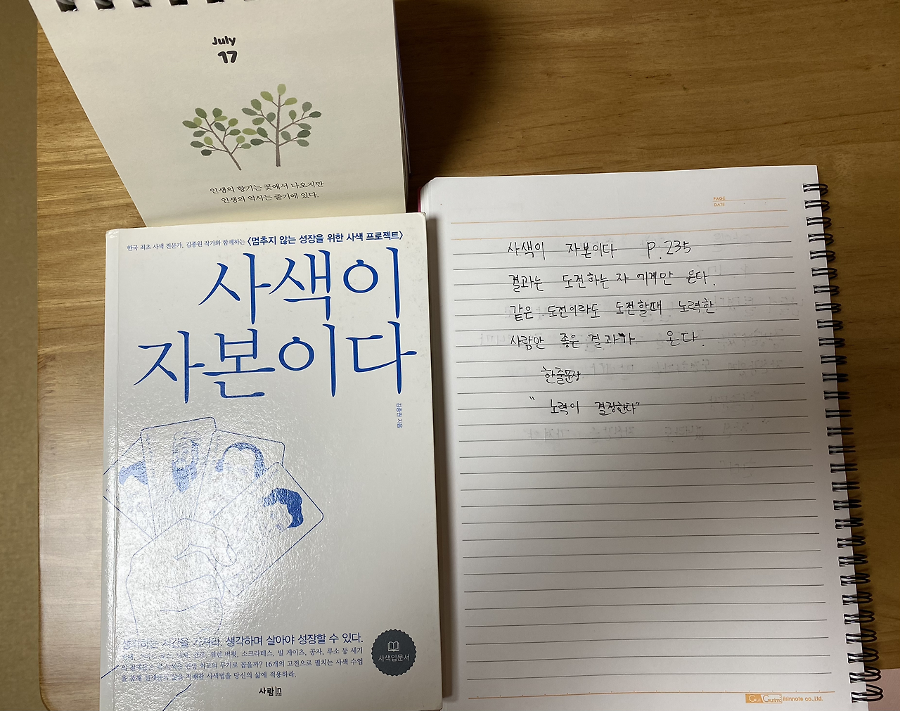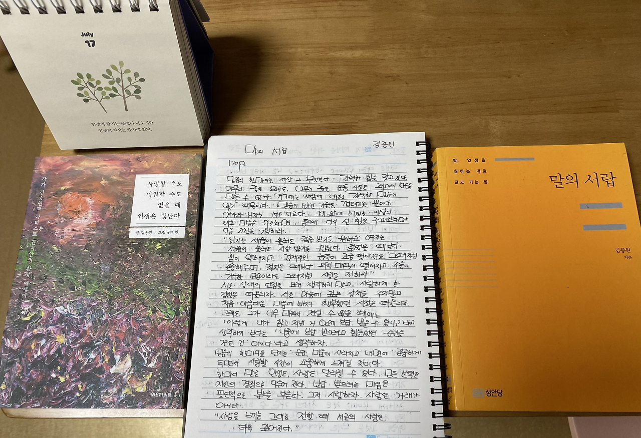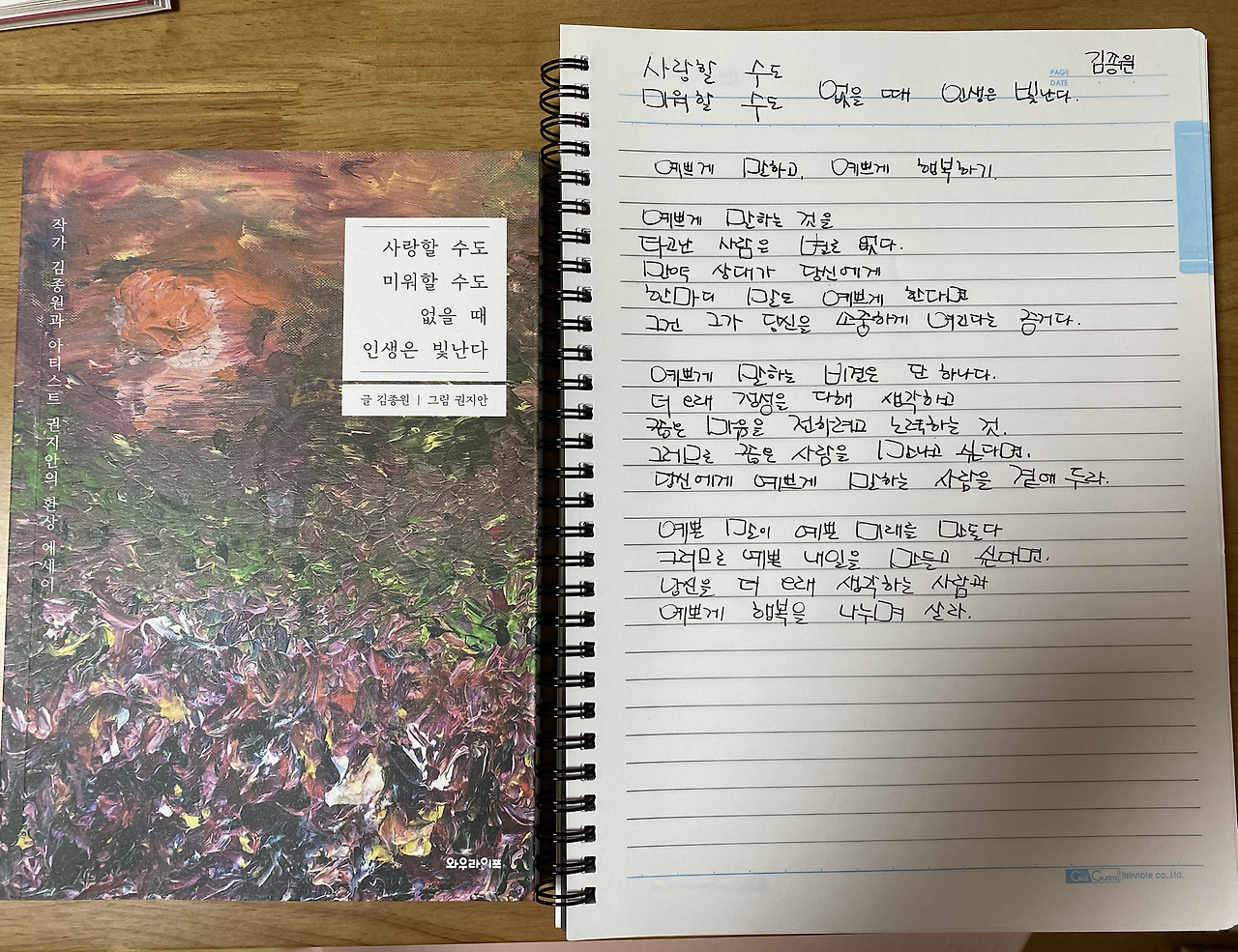 그럴수록 나는 내가 다시 부끄러워지는 것을 참고 싶지 않아서 매일 수행하는 엄마가 되고자 지성이 뿌린 좋은 글 안에서 필사의 길을 걸어야만 내가 그 안에서 강하게 멈출 수 있는 용기를 발견한다. 사랑하기에 아이와 부모가 자신의 길을 걸을 줄 아는 시간을 보내야 더 분명 해지는 자기의 생각과 의지를 키우며 살 수 있게 된다.